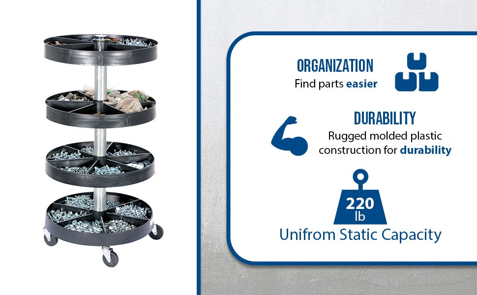 Cut parts picking time in half with these space saving, rotating Parts Bins. Compact enough to fit in small spaces such as corners and ends of aisles. Great for organization of small parts. Ideal for use in commercial and industrial applications. Rugged molded plastic construction with four swivel casters for portability. Each shelf is 2-1/8" deep. The space between the shelves is 8".
