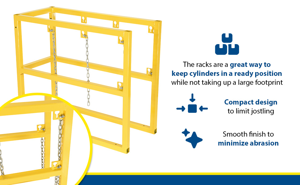 Cylinder barricade racks keep cylinders steady and in place when not in use. The racks are great way to keep cylinders in a ready position, while not taking up a large footprint. Powder-coated surface for added toughness throughout daily use.