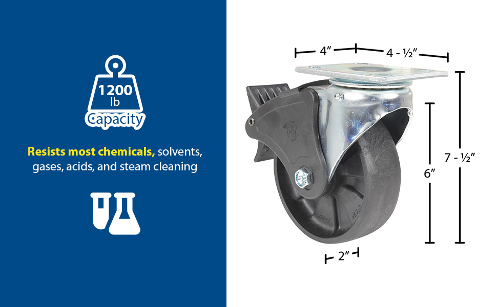 Made of high-tech proprietary glass filled nylon (RX). Provides better impact resistance than standard glass filled nylon. Does not absorb moisture like phenolic, and offers better floor preservation than steel or cast iron. Resists most chemicals, solvents, gases, acids and steam cleaning. Top plate measures 4 x 4-1/2". Black tread color. 85 (+/-5) Shore D. Wheel core material is glass filled nylon.