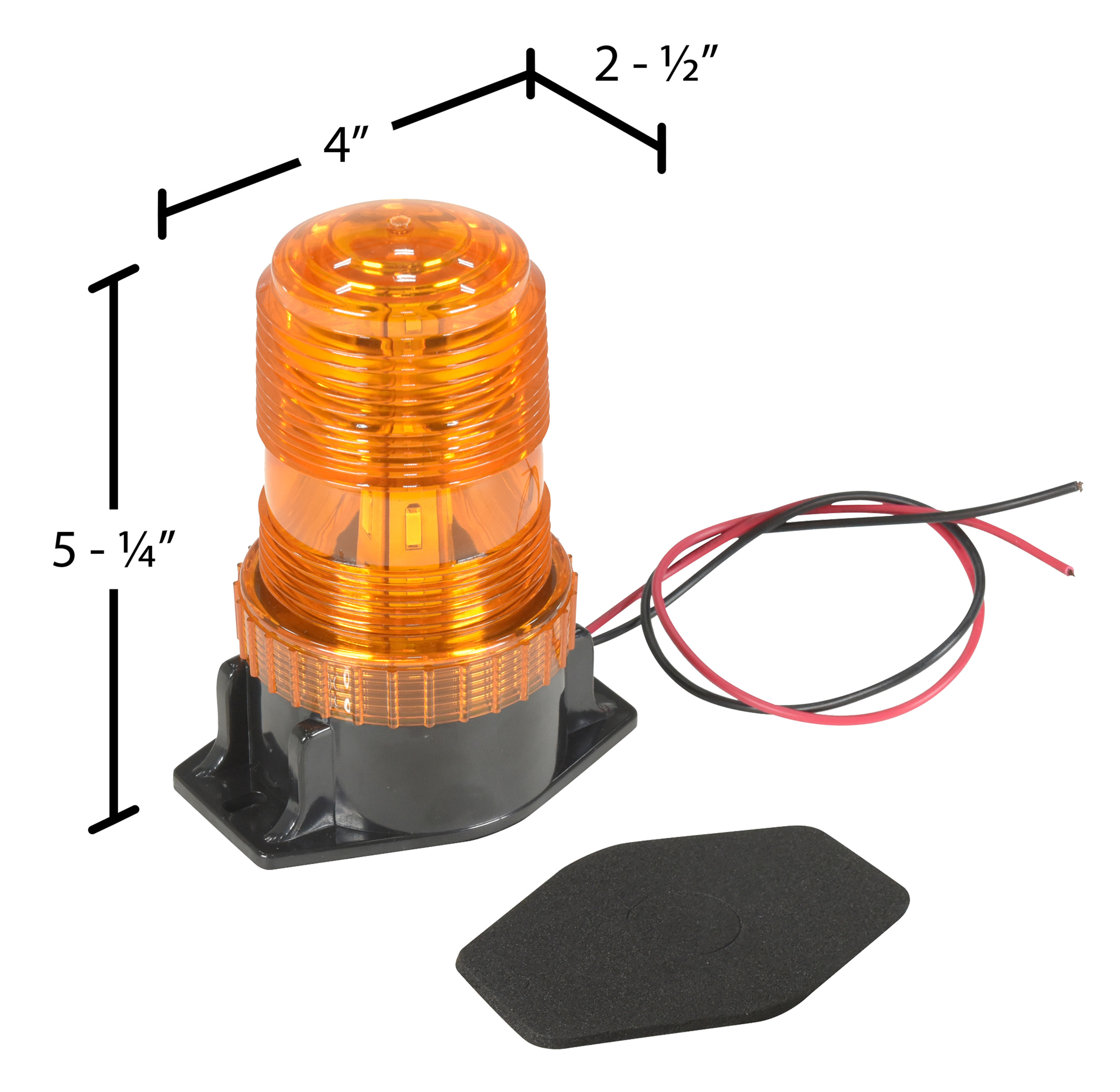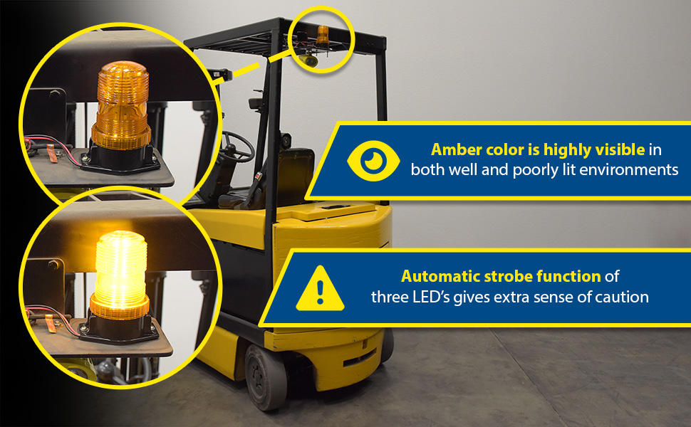The fork truck safety and warning light helps keep equipment and personnel safe in industrial surroundings. The amber color is highly visible in both well and poorly lit environments, while the automatic strobe function of three LED's gives an extra sense of caution. A strong polycarbonate housing design with a permanent or temporary mounting choice maintains strength and durability throughout a variety of conditions. Gasket for water seal protection and hardware are included.