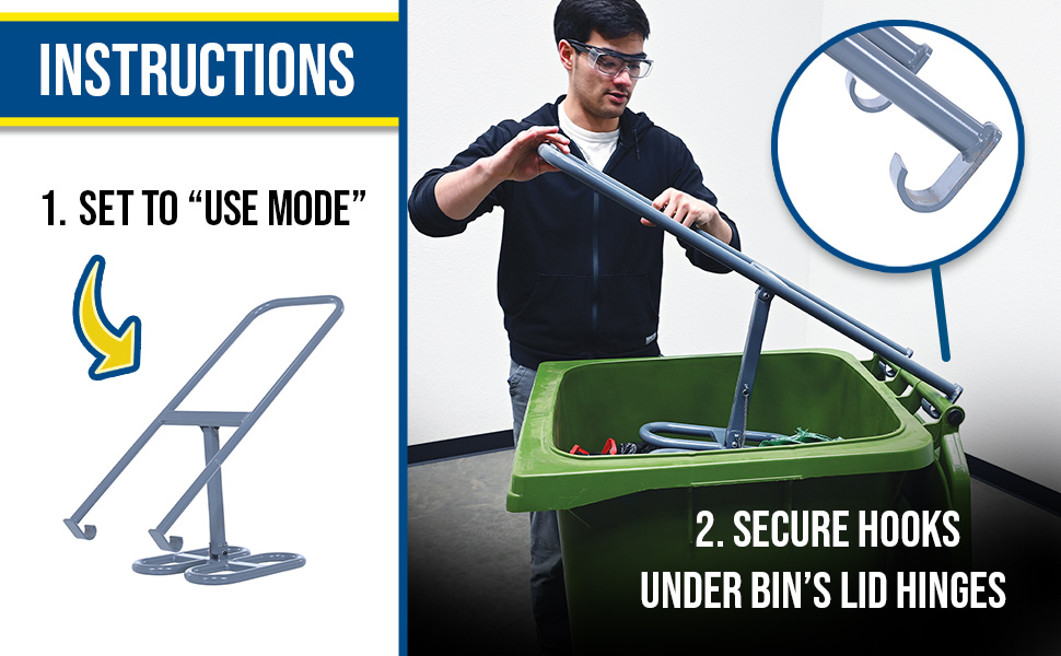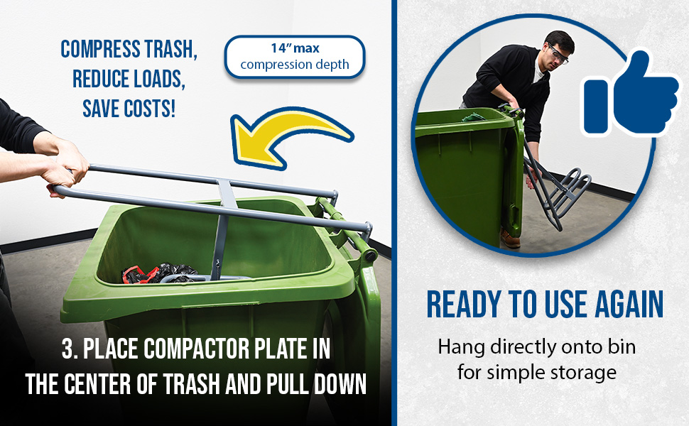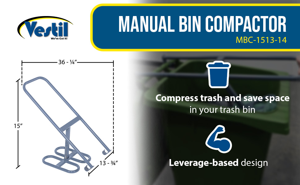 The Vestil Manual Trash Bin Compactor offers a highly efficient, space-saving solution to overflow and bulky waste-bin problems often encountered in facility operations. Its lever‐based design allows for fast compression—simply attach the compactor under the lid hinges of standard 64- or 95-gallon bins, pull the lever, and the compression plate reduces contents by up to 14 inches. This means fewer trips to empty bins, less wasted overhead and space, and a cleaner, more organized collection area. With its powder-coated steel construction, the unit is built to withstand industrial environments while hanging neatly on the bin when not in use.
