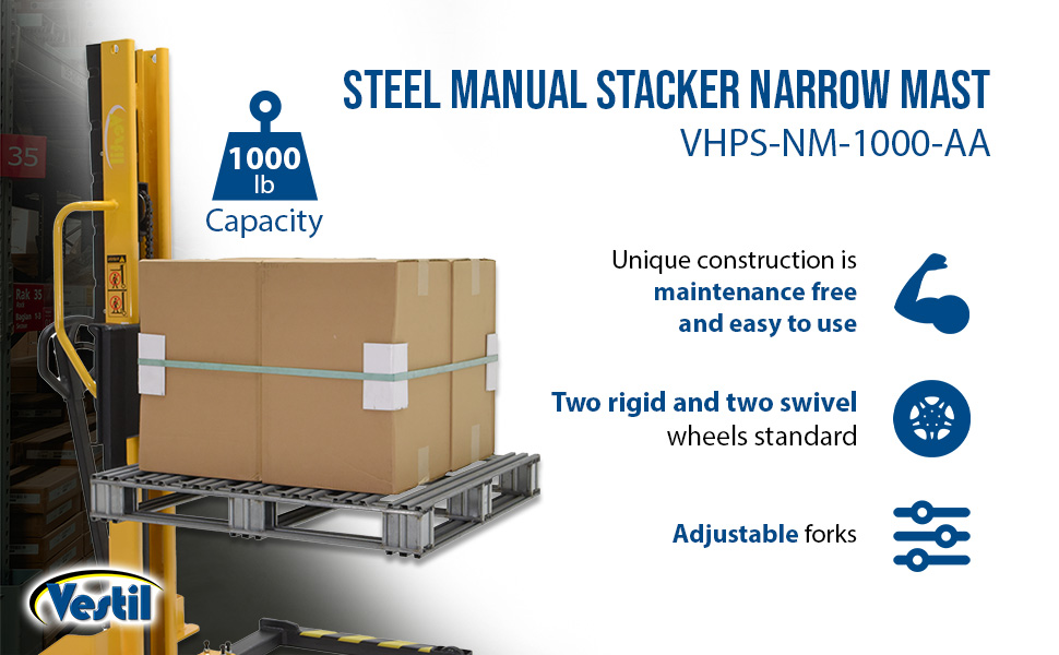 | Steel Manual Stacker Narrow Mast Adjustable Forks/Legs 1,000 Lb. Capacity Black / Yellow | Uniform Capacity (lb.): 1,000 Service Range (in.): 2-1/8 to 62 | 472 |