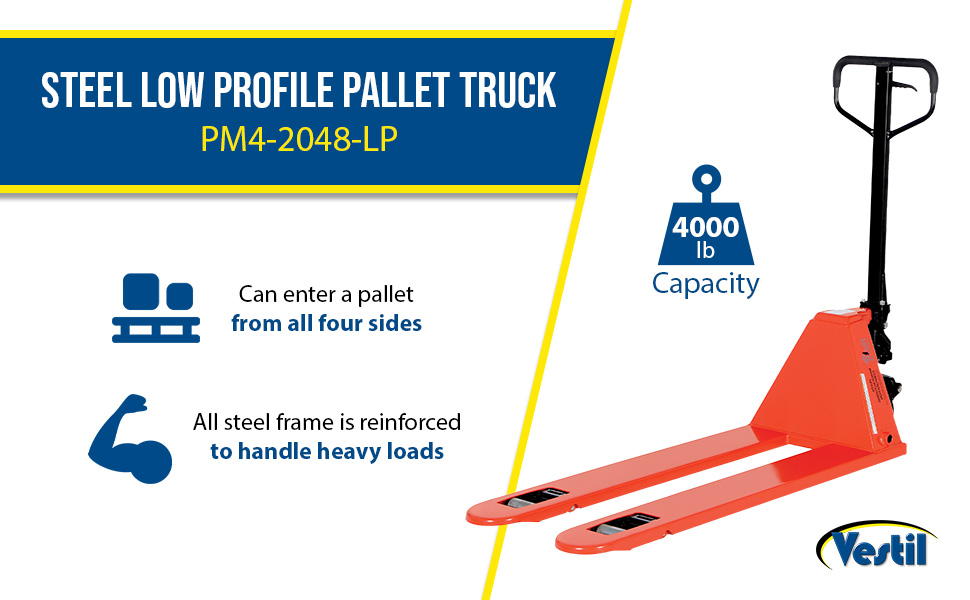 PM4-2048-LP PM4-2048-LPSteel Low Profile Pallet Truck 61 In. x 20-1/2 In. x 49 In. 4000 Lb. Capacity RedUniform Capacity (lb.): 4000