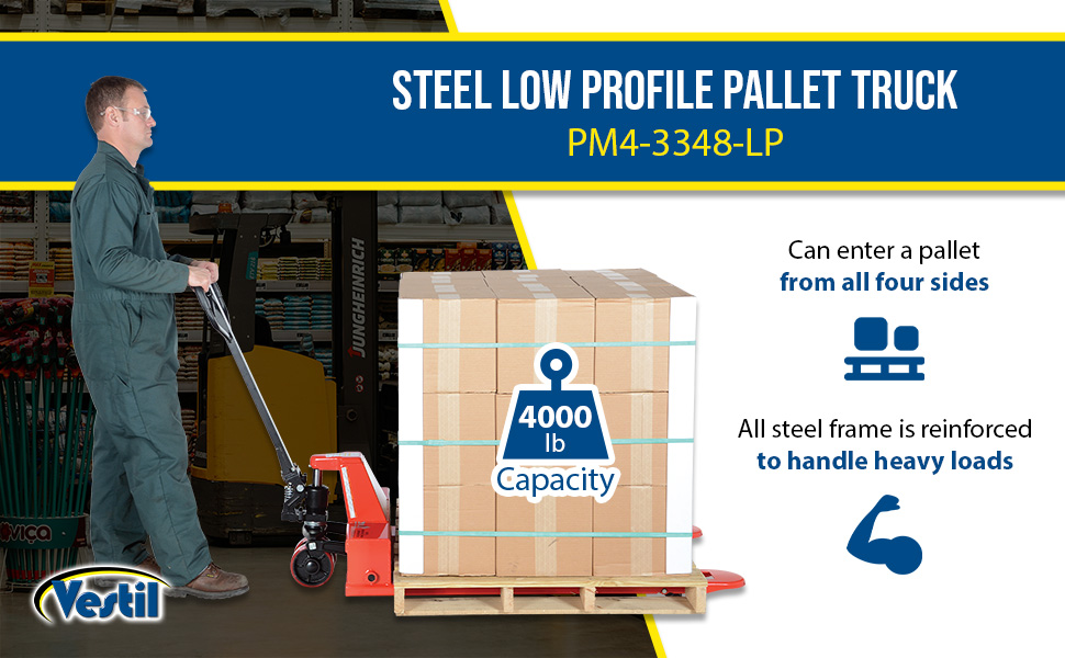 PM4-3348-LP PM4-3348-LPSteel Low Profile Pallet Truck 63 In. x 33 In. x 48 In. 4000 Lb. Capacity RedUniform Capacity (lb.): 4000