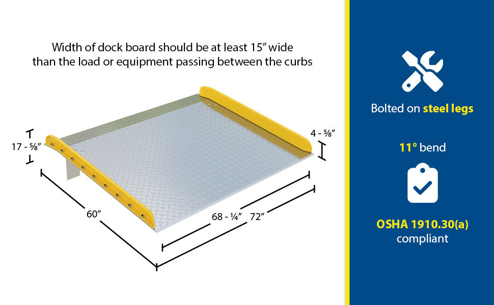 | Aluminum Dock Board Steel Curb 60 In. x 72 In. 15,000 Lb. Capacity Silver | Uniform Capacity (lb.): 15000 Height Difference at 11 degree/19 percent (in.): 12 | 251 |