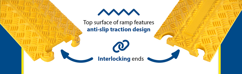 Designed to protect hose and cable from roll-over damage. Ideal for office and pedestrian applications. Interlocking design connects units for longer lengths. Top surface of ramp features anti-slip traction design. Manufactured from black molded rubber.