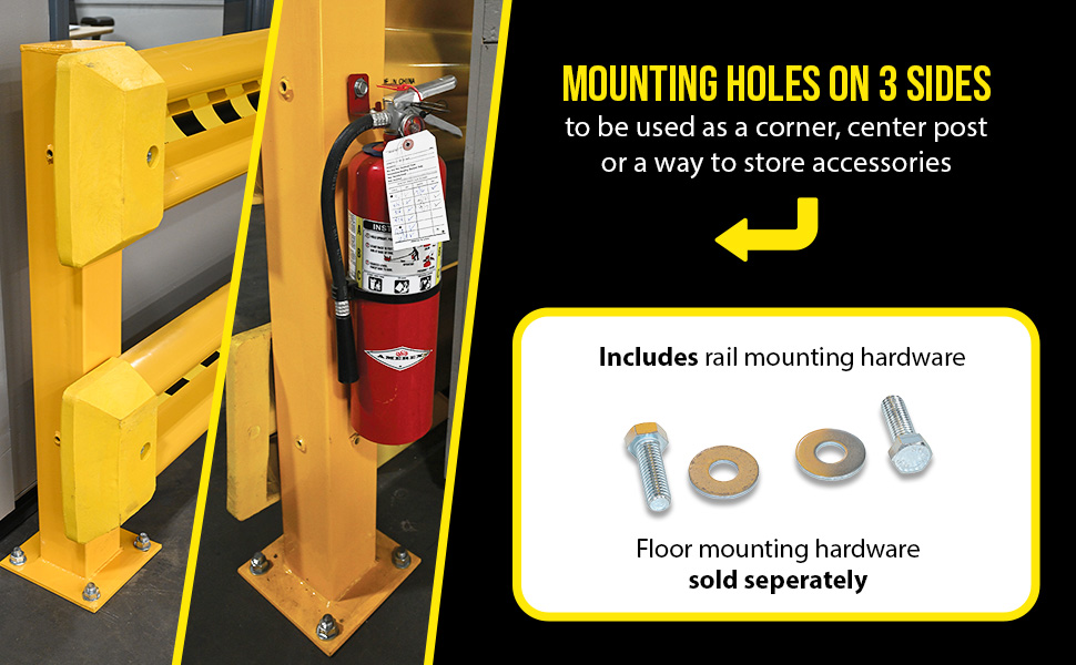 Protect personnel and equipment both visually and physically with our Guard Rail Systems. These economical systems can be utilized indoors or outdoors. Ideal for protecting corners of buildings and machinery from fork truck and vehicle damage. Choose between one, two, or three high rail systems. Tubular posts are machined for continuous or perpendicular rail mounting. GR series has rail slotted mounting holes 3/4" x 2-1/2" provided. Rail mounting hardware is included with posts. Floor mounting hardware is sold separately. Deduct 5" when overlapping on a shared post. Units are rated for 4,000 lbs. at 4 mph.