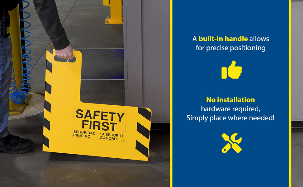 Protect busy corners, expensive machinery and personnel with 90 degree perpendicular protection. "SAFETY FIRST" promotion reminds personnel of the number one priority. Steel units include a baked in powder coated yellow finish for added toughness.