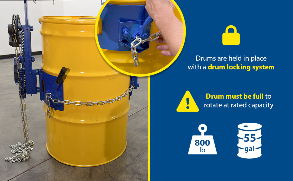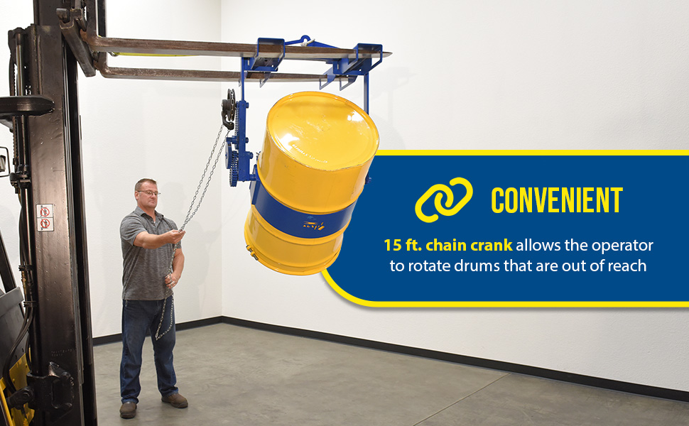 Rotate and position a fully loaded 55 gallon steel drum with ease. Use with an overhead hoist or a fork truck. Fork pockets measure 5-1/2"W x 1-15/16"H usable. Features a chain crank that allows the operator to rotate 360 degrees drums that are out of reach. Drums are held in place with a drum locking system. Meets OSHA 1910.179 requirements. Model DCT-2000 features gear box operation. Models ending with suffix "4WFP" have bolt on fork pockets for 4 way entry, usable 5"W x 1-9/16"H and 5-1/2"W x 1-15/16"H.
