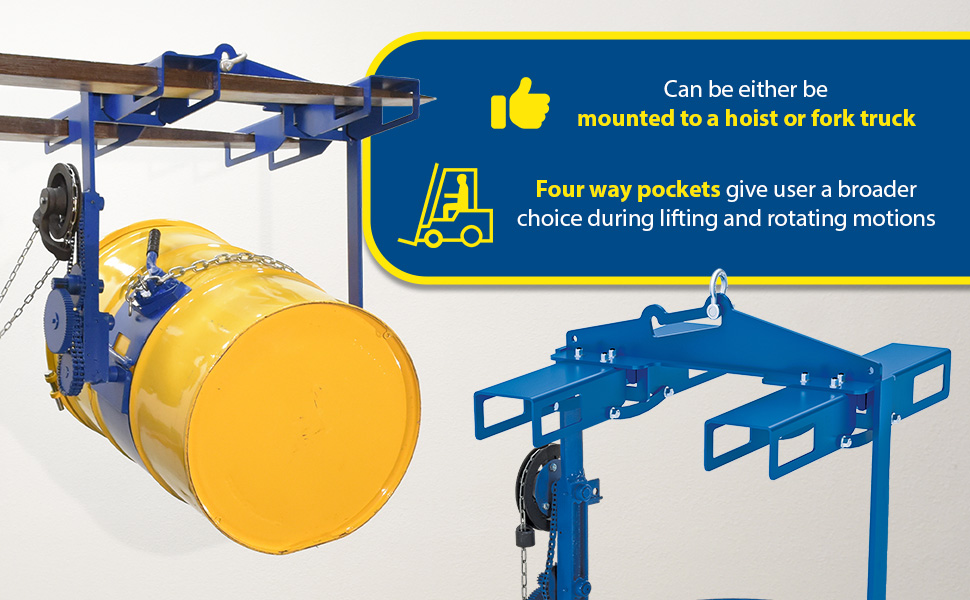 DCT-85-4WFP DCT-85-4WFPSteel Hoist Mounted Drum Carrier/Rotator with Four Way Pocket 55 Gallon 1500 Lb. Capacity BlueUniform Capacity (lb.): 1,500