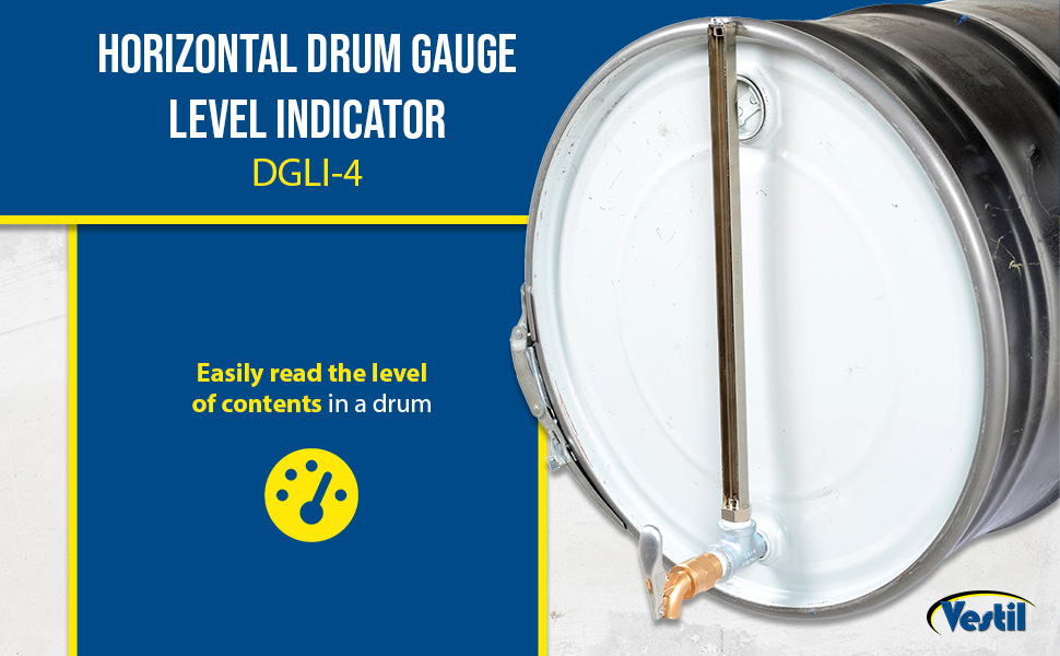 The DGLI-4 allows personnel to read the level of contents in a drum. Accommodates 3/4" faucet. 18-3/8" site gauge. For use with plastic or steel drums. Works well with most oils, solvents, and chemicals. Faucets sold seperately.