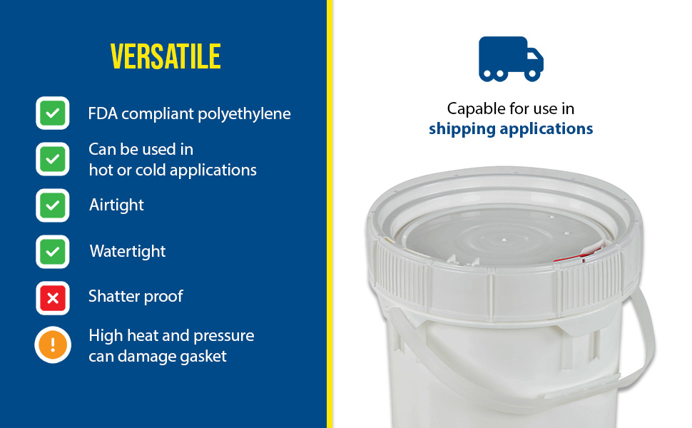 Lids for use with plastic and steel pails. All plastic lids are constructed of 100% prime virgin high density polyethylene (HDPE) and comply with FDA regulations. Suitable for shipping according to D.O.T. standards. Steel crimp-style lids with and without spout available for steel pails.