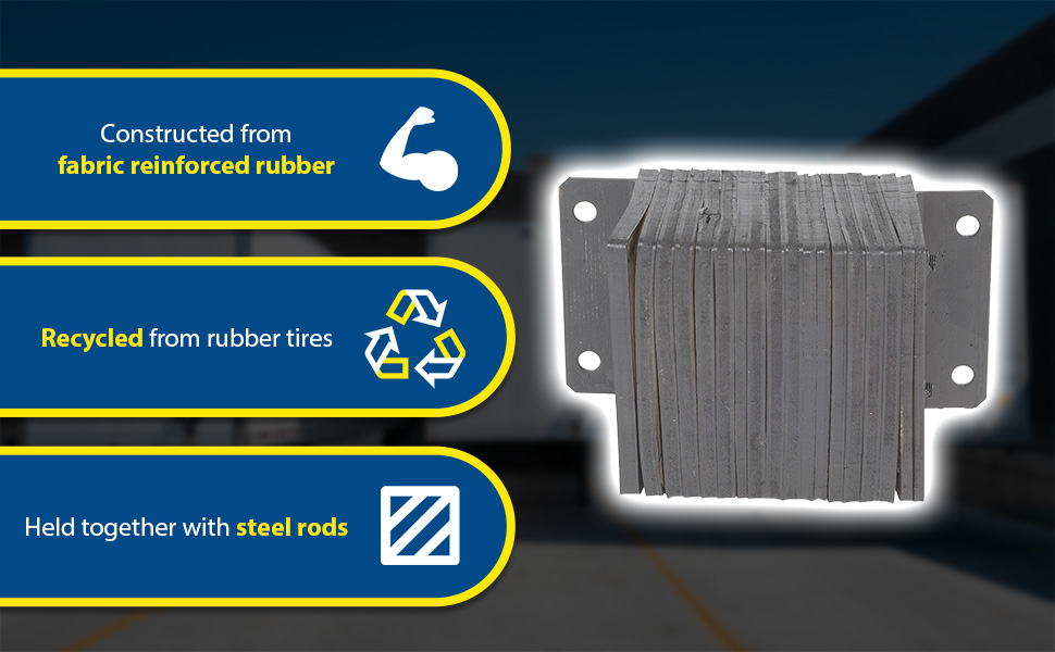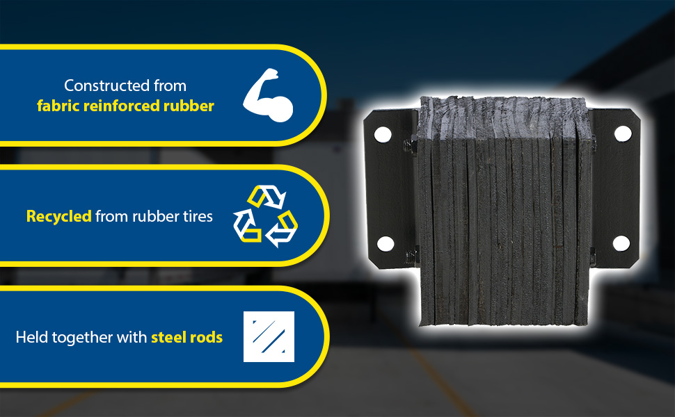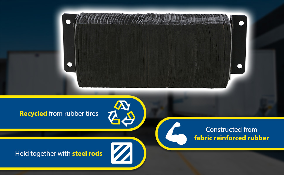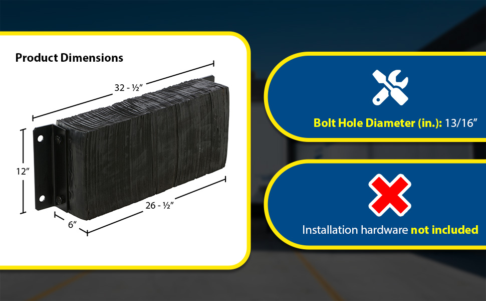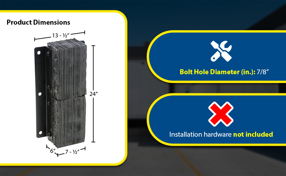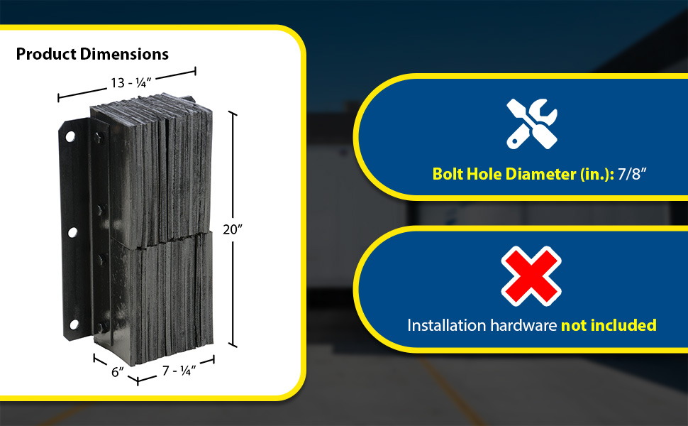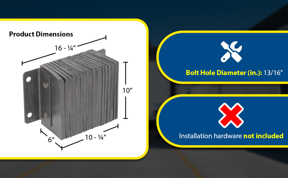 Laminated style dock bumpers provide durable, economical protection for your loading dock and trailers. Units are constructed of fabric reinforced rubber from recycled truck tires. Pads are laminated between painted structural angles and held together with 3/4" steel tie rods. A 12" long center support bracket is included with the 96" wide bumpers. Installation is quick and easy by bolting or welding units to the dock. Width is measured bolt hole center to bolt hole center, except Type C. Width is actual bolt hole center 1014-4.5F is 6", 1214-4.5F is 6-7/8". Bolt holes are 13/16" diameter on type A & C bumpers and 7/8" diameter on type B bumpers.
