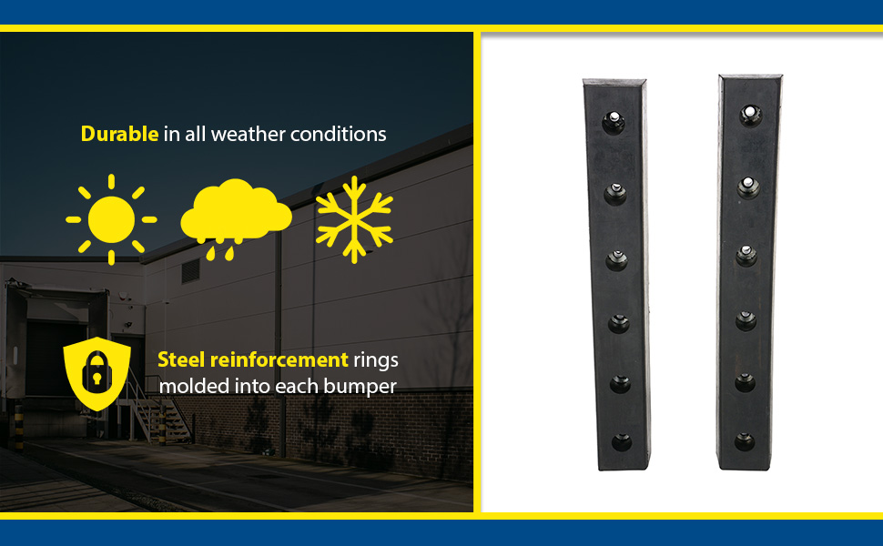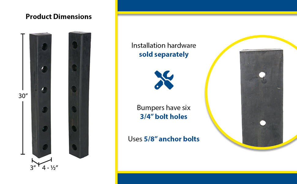 These pre-drilled bumpers are constructed of fiber reinforced rubber containing nylon and polyester for all weather conditions. Provides high impact resistance. Steel reinforcement rings are molded into each bumper for installation. Uses 5/8" anchor bolts. Sold individually. Order installation hardware separately.