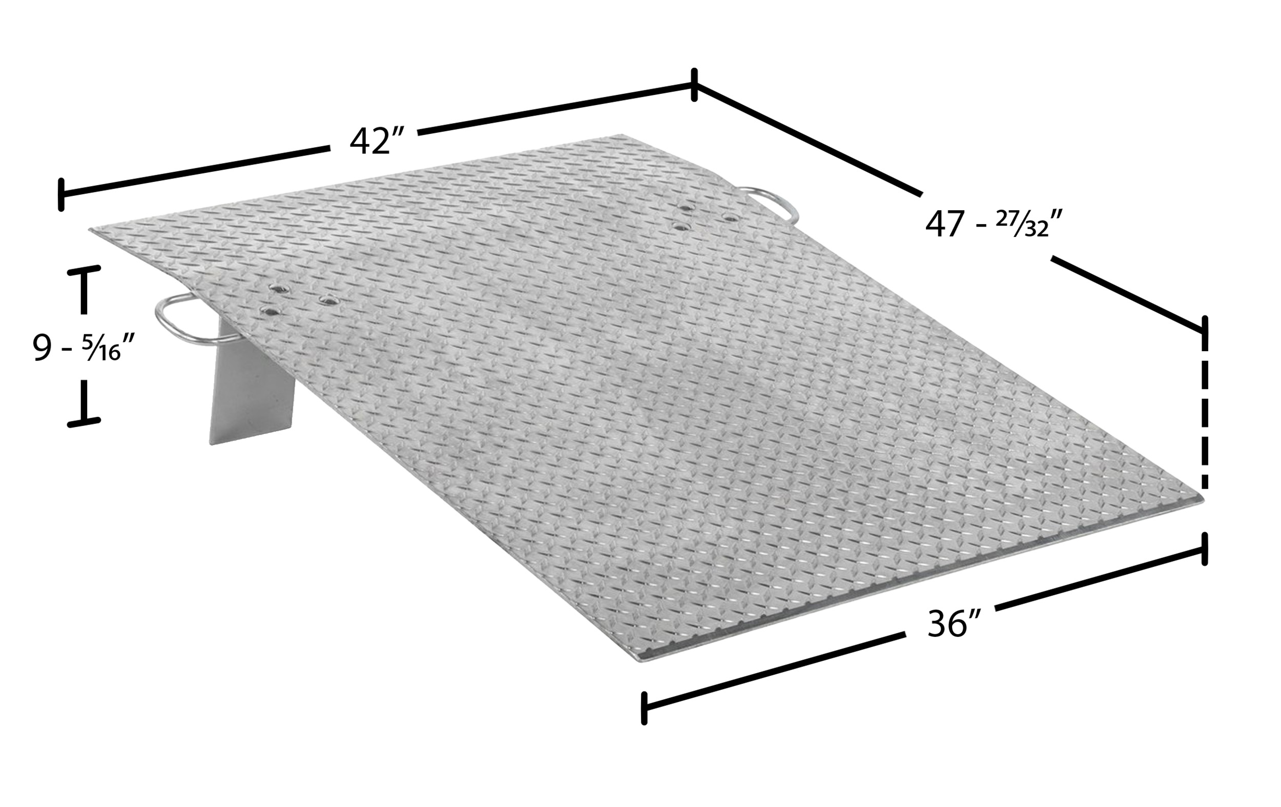 Aluminum Hand Truck Dock Plate 36 In. x 48 In. 700 Lb. Capacity SilverThis Aluminum Hand Truck dock plate is designed for use with two (2) wheel hand trucks. It is a convenient, safe, and easy way to access loading docks from trucks. This dock plate is lightweight and easily transported by just one person. The tread plate surface ensures skid-resistant safe traction and the locking legs secure the plate for safe loading and unloading. Complete with bolt-on zinc plated carrying handles and locking legs.