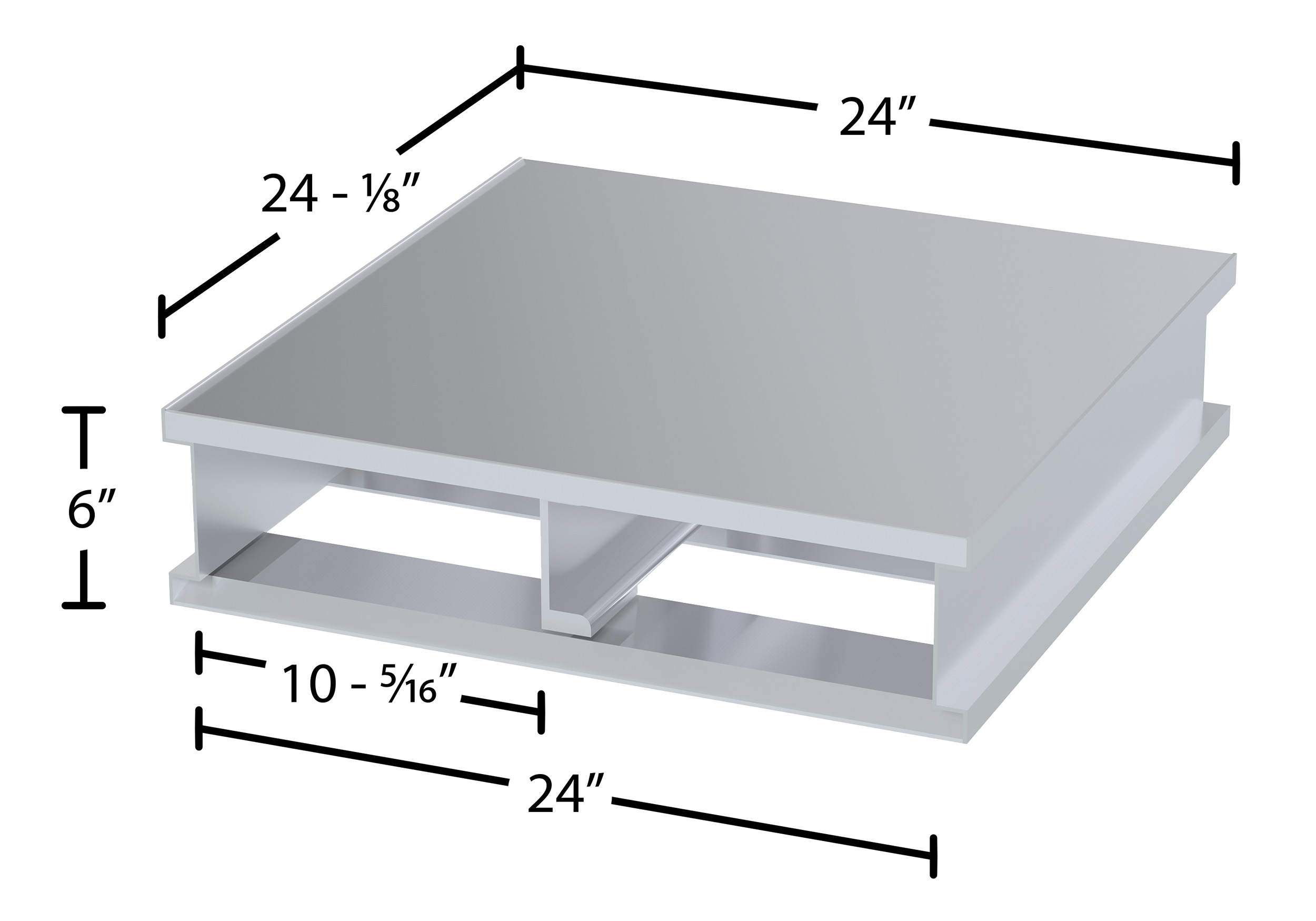 Aluminum Heavy Duty Solid Top Half Pallet 24 In. x 24 In. x 6 In. 4000 Lb. SilverAn Aluminum half pallet is a great asset for a variety of industries. With the half pallet design, items can be chosen and fitted to a pallet much closer to their size. This utilizes and maximizes space during shipping and floor space during any storage. The solid top design enables quick and simple cleaning, while the two-way provide quick access.