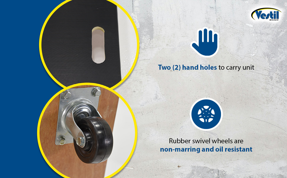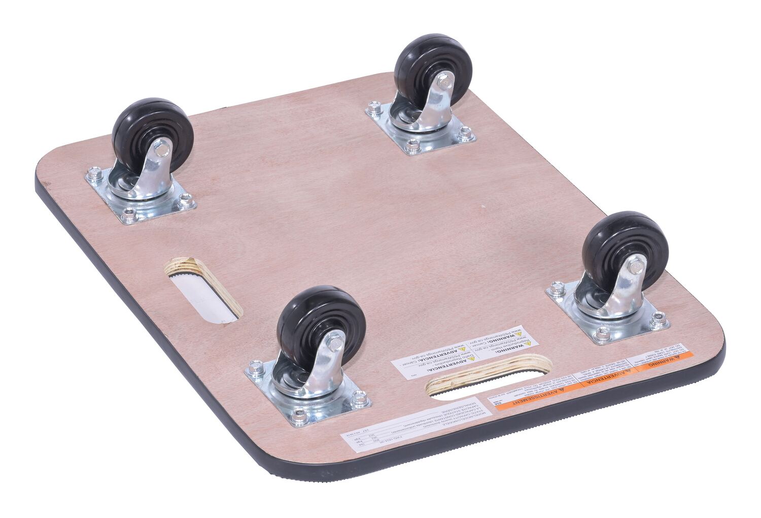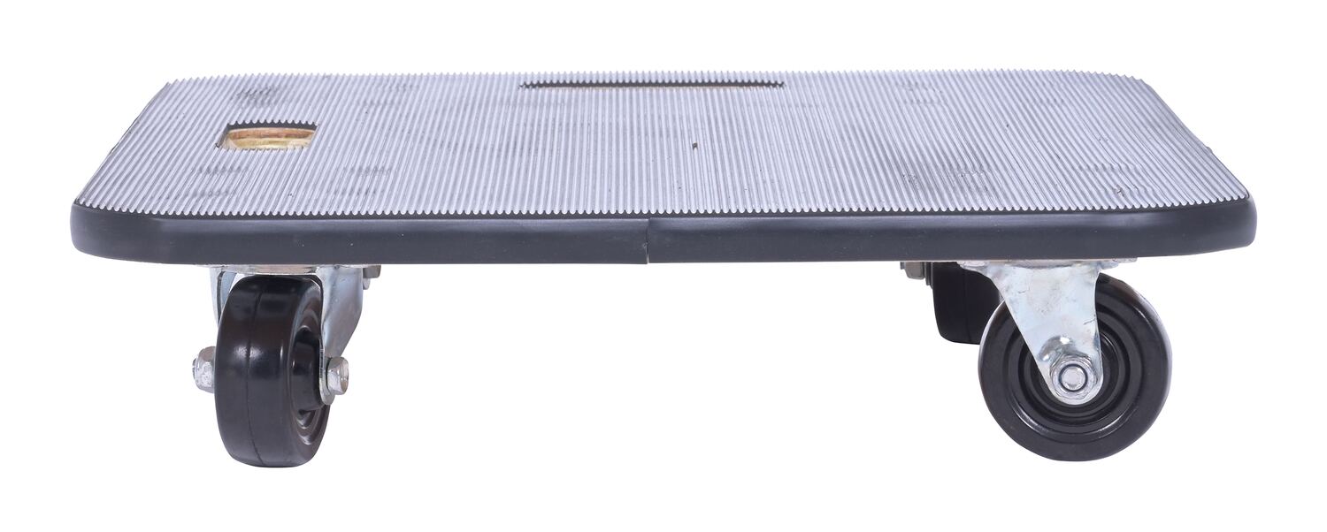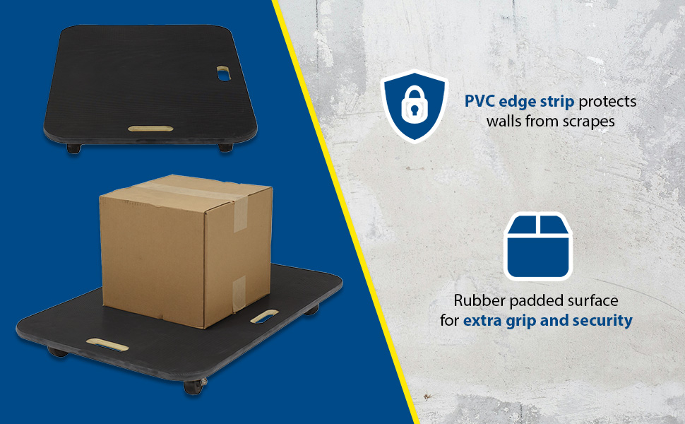 Fiberwood construction dollies feature a rubber padded surface and two hand holes to carry the unit. The PVC edge strip protects walls from scrapes. Units roll on four swivel wheels which are non-marring and oil-resistant. Casters may not be attached for shipping purposes.