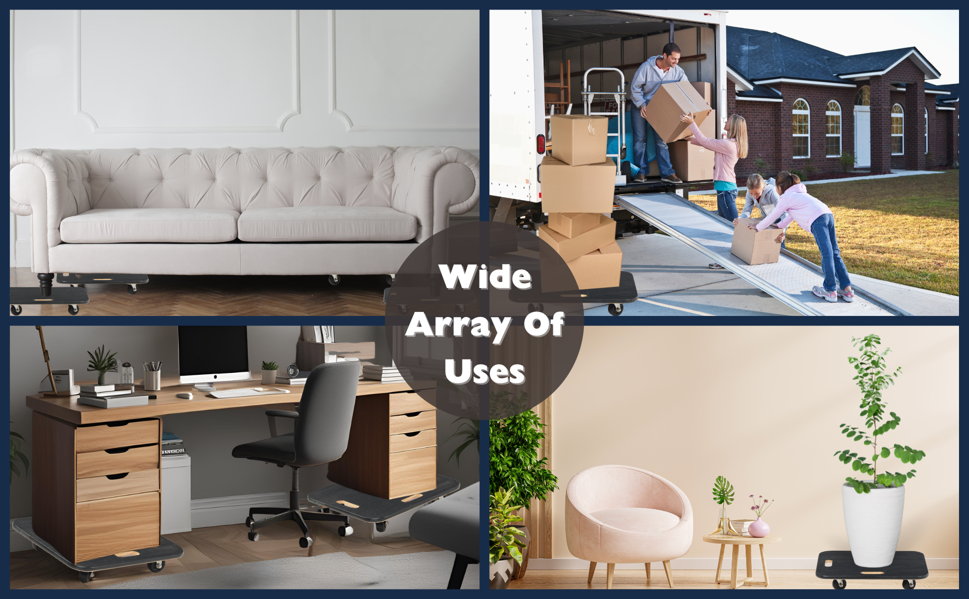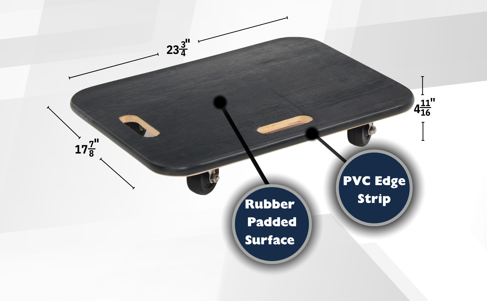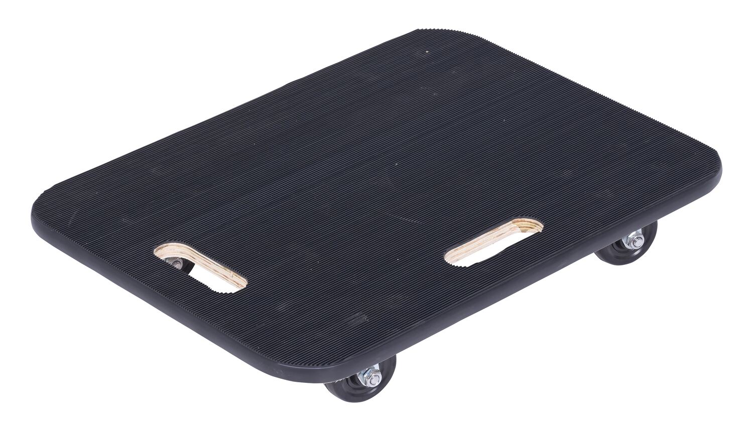 Fiberwood construction dollies feature a rubber padded surface and two hand holes to carry the unit. The PVC edge strip protects walls from scrapes. Units roll on four swivel wheels which are non-marring and oil-resistant. Casters may not be attached for shipping purposes.