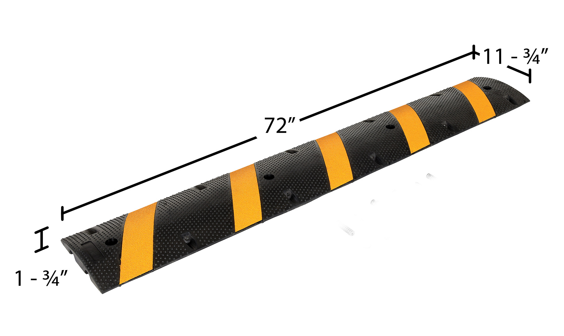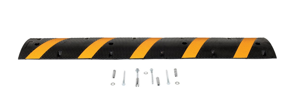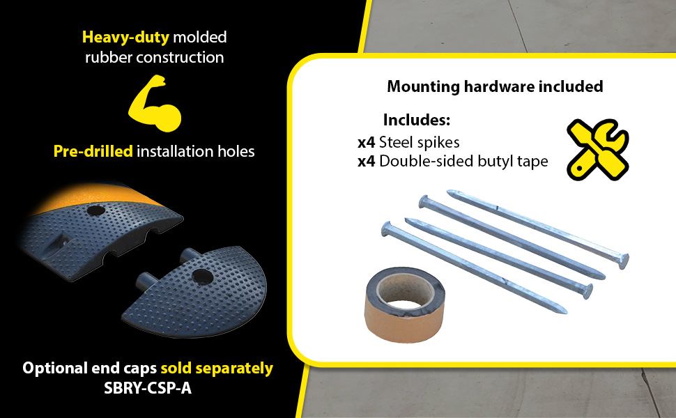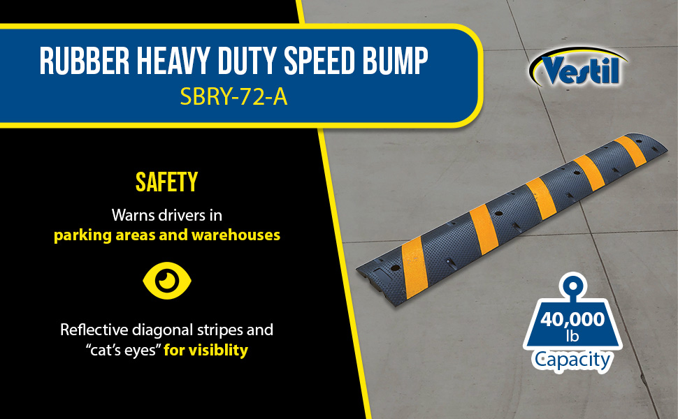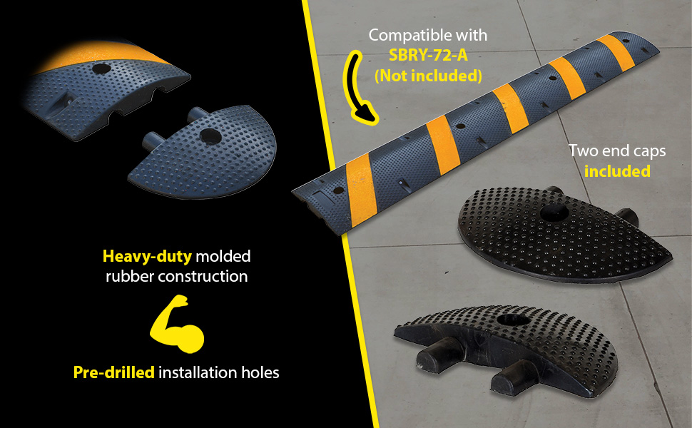 SBRY seriesHeavy-duty molded rubber construction for durability. Rubber includes UV stabilizer for longer life. Features five reflective yellow diagonal strips and "cats eyes" per side for better visibility. Four mounting holes per speed bump, hardware included. Maximum capacity is 40,000 pounds. End caps are available separately.