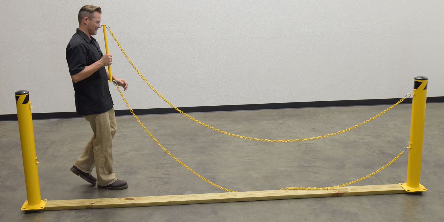 The Dock Chain Bollard Barrier Systems are safety yellow visual barriers that consist of 2 bollards and two chains that span up to 10'. Mounting brackets fasten to each bollard to provide attachment points for the chains. Chain attachments to the bollards are 21" and 41" above the floor. Chain length is customizable upon request.