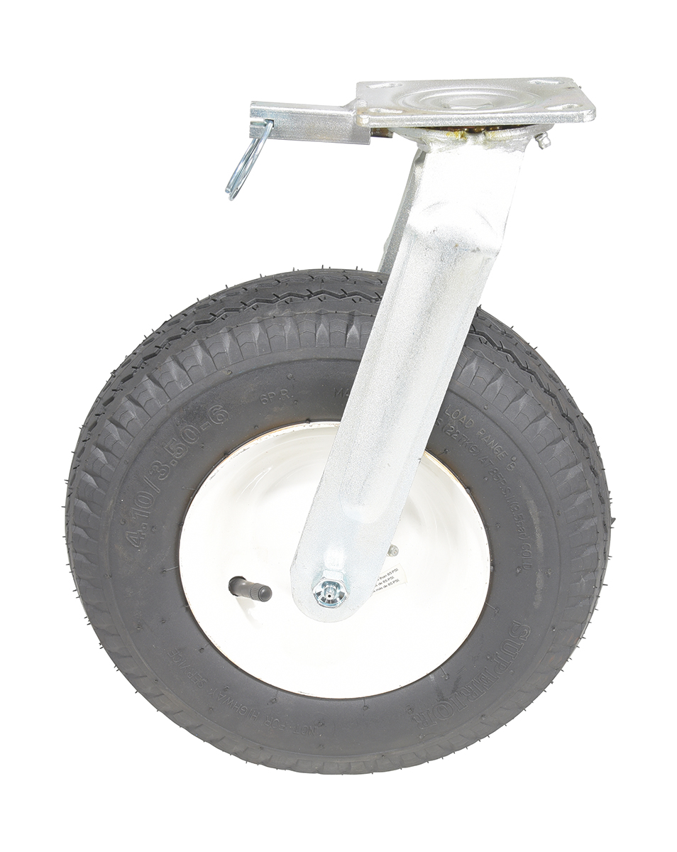 Pneumatic wheels are quiet rolling and shock absorbing. Tube type tire, quiet and shock absorbing.