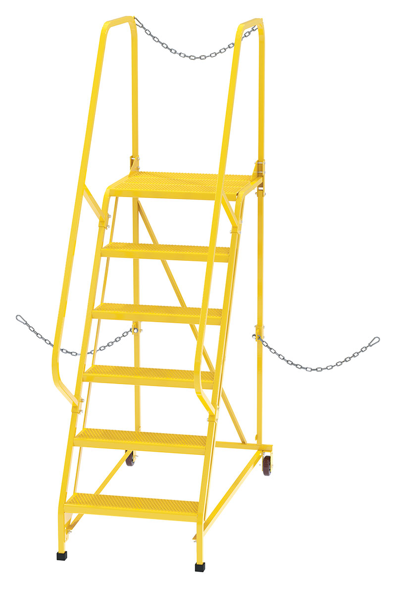 Semi-Trailer Access Ladders are for use getting into Semi-Trailers. Tilt the unit to allow for portability. Units roll on 4" poly-on-poly wheels. Constructed of square tubing framework which handles uniform capacities up to 350 lbs. Features 30" high removable hand railing, access chain, 21" deep top platform, and an industrial baked-in blue powder coat finish for toughness. Each step measures 24" wide by 7" deep and is spaced 10" apart. Climb Angle is 58 degrees.