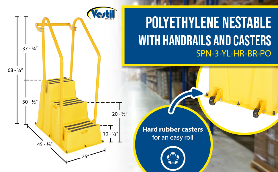 A poly step stool is a great asset for on the go or in a permanent setting. A lightweight design with front and side cutout handles, allow the user to easily transfer the stool to a preferred spot. The taped step surfaces ensure safe footing while traversing up and down the steps. Includes bolt on handrail and casters. The hand rails height allows the unit to be pushed or pulled into the desired position, minimizing bending and twisting by the user. Steps can be nested to minimize footprint when not in use.
