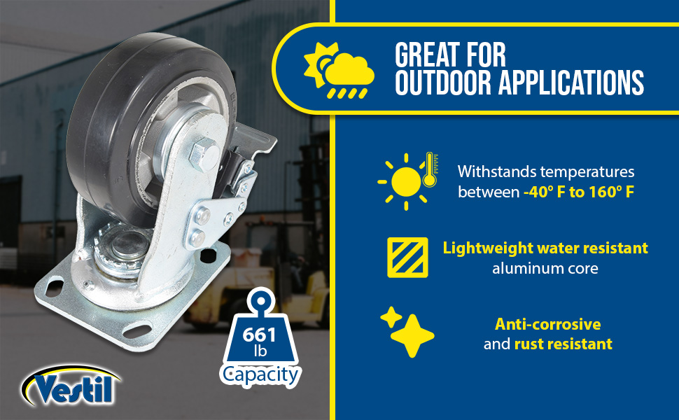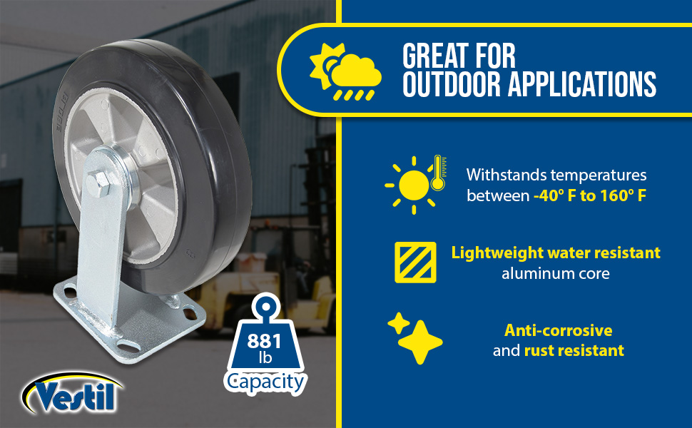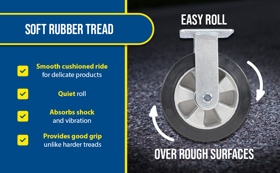 Soft rubber provides a smooth cushioned ride for delicate products. combined with a lightweight, rust resistant aluminum core, this caster is great for wet, outdoor environments.