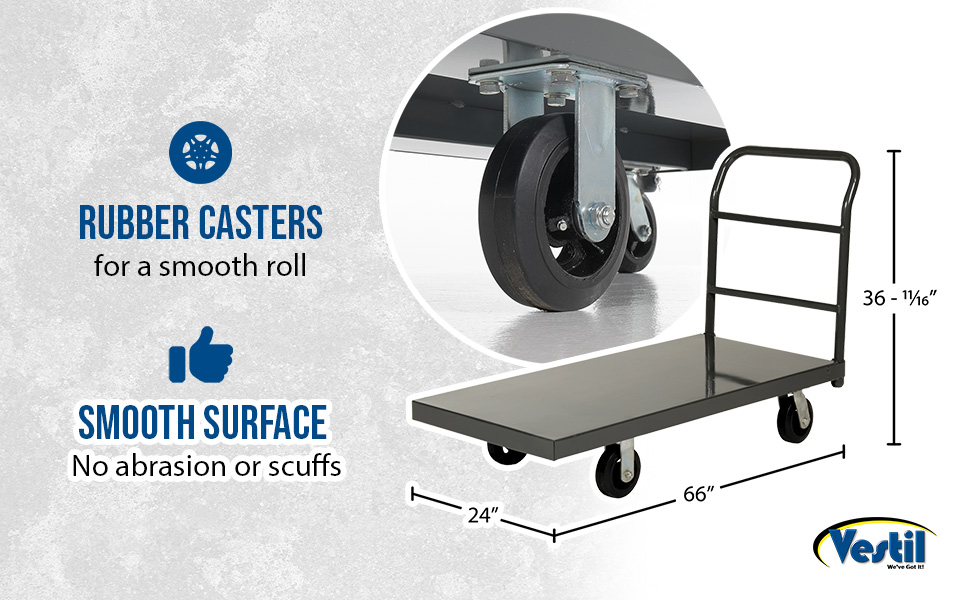 A steel tread plate on a platform truck is an upgrade to an old classic. A tread plate design enables the user with a better sense of security. With this added texture, the amount of jostling and movement by the products on the platform is limited. The steel handle allows the user to maintain an ergonomic posture while transferring goods. Mold on rubber casters roll smoothly. Powder coated finish provides added toughness.