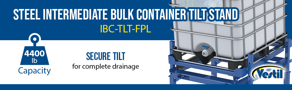 An Intermediate Bulk Container Tilt support stand is designed of a sturdy steel construction which, provides a secure tilting of containers for complete draining. The adjustable height of the stand allows for easy access to valve connections and minimizes user bending and twisting. To use, simply place the container on the stand. When the container is in the secure position, start the draining process. As the fluid flows from the container, the rear of the stand platform will rise up creating an angle for a better release of fluids. The stand has pre-drilled mounting holes for simple mounting to a variety of surfaces and fork pockets for simple movement, if necessary.