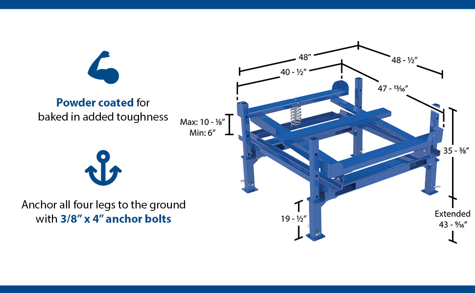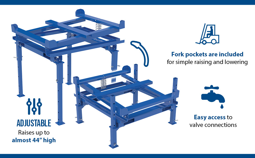 IBC-TLT-FPL IBC-TLT-FPLSteel Intermediate Bulk Container Tilt Stand with Fork Pockets and Adjustable Legs 48-1/2 In. x 49-1/2 In. 4400 Lb. Capacity BlueUniform Capacity (lb.): 4,400