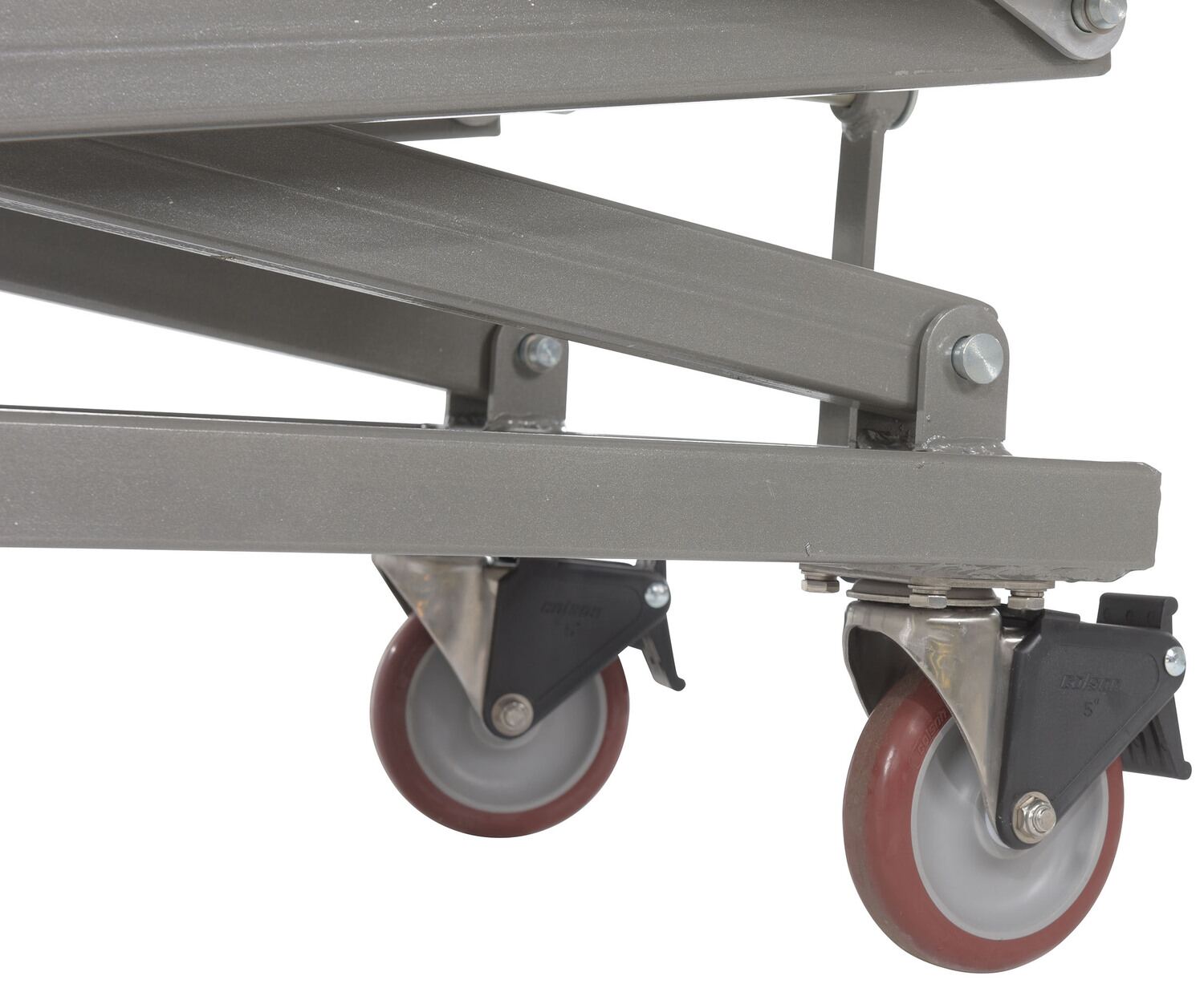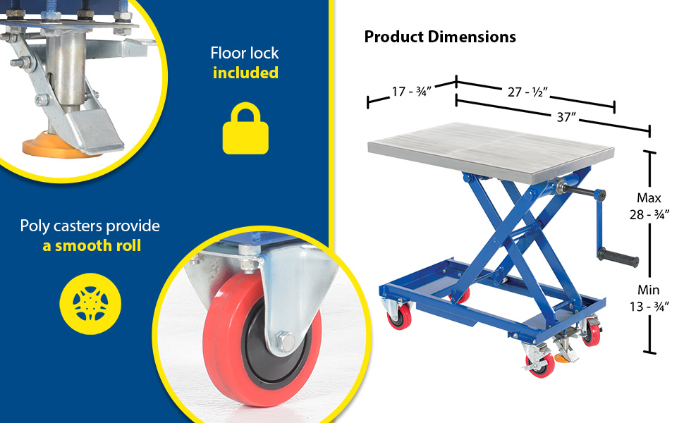 When lifting and transporting are both essential, look no further than the Mechanical Scissor Cart. The centrally located hand crank allows the user to raise and lower the platform to a more exact level. A large platform gives the ability to load items in a variety of sizes. Since the platform can be maneuvered to a specific height, the unit can be positioned to best fit the users' needs for a more ergonomically friendly experience. Poly casters are included for a smooth roll on a variety of surfaces.*Smooth steel top minimizes abrasions