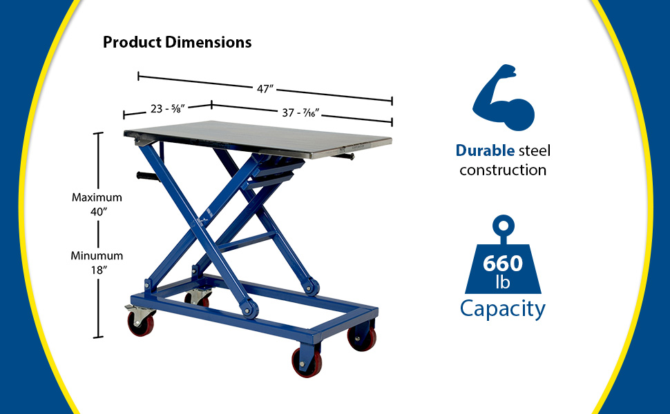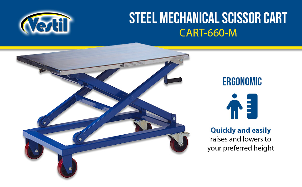 CART-660-M CART-660-MSteel Mechanical Scissor Cart 37 In. x 23-1/2 In. 660 Lb. Capacity Blue/SilverUniform Capacity (lb.): 660