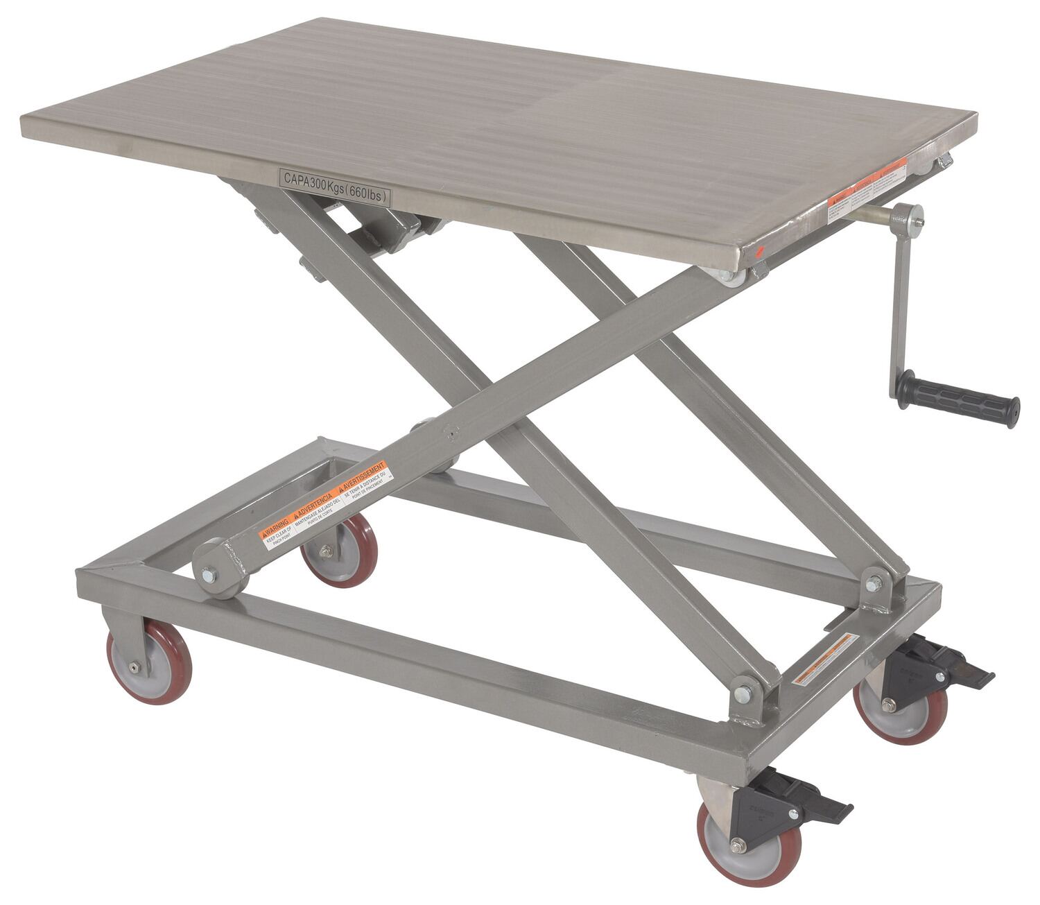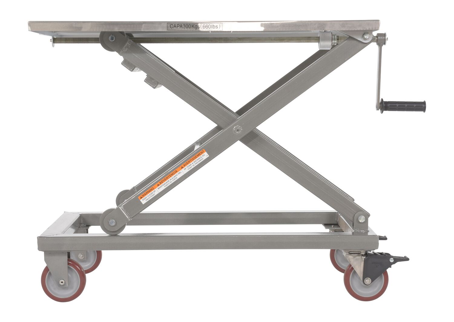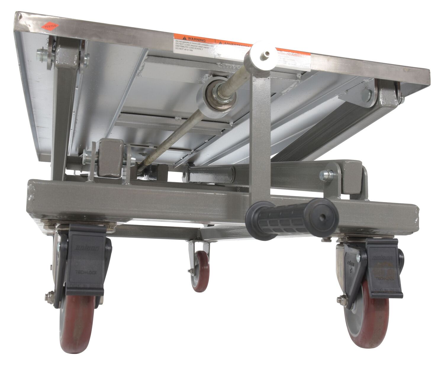 Raise and lower material quickly and easily with Mechanical Scissor Carts. Carts roll smoothly on two rigid and two swivel poly-on-ploy casters. Mechanical screw drive provides precise positioning with no downward drift. The partially stainless steel cart features a stainless steel platform, frame, handle, caster rigs and hardware. Crank assembly and scissor legs are zinc plated/painted.