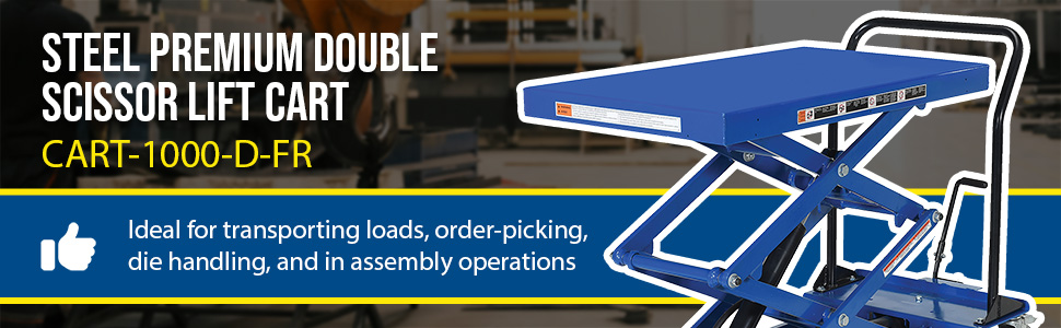 CART-1000-D-FR CART-1000-D-FRSteel Premium Double Scissor Lift Cart with Foot Release 24 In. x 40-1/2 In. 1000 Lb. Capacity BlueUniform Capacity (lb.): 1,000
