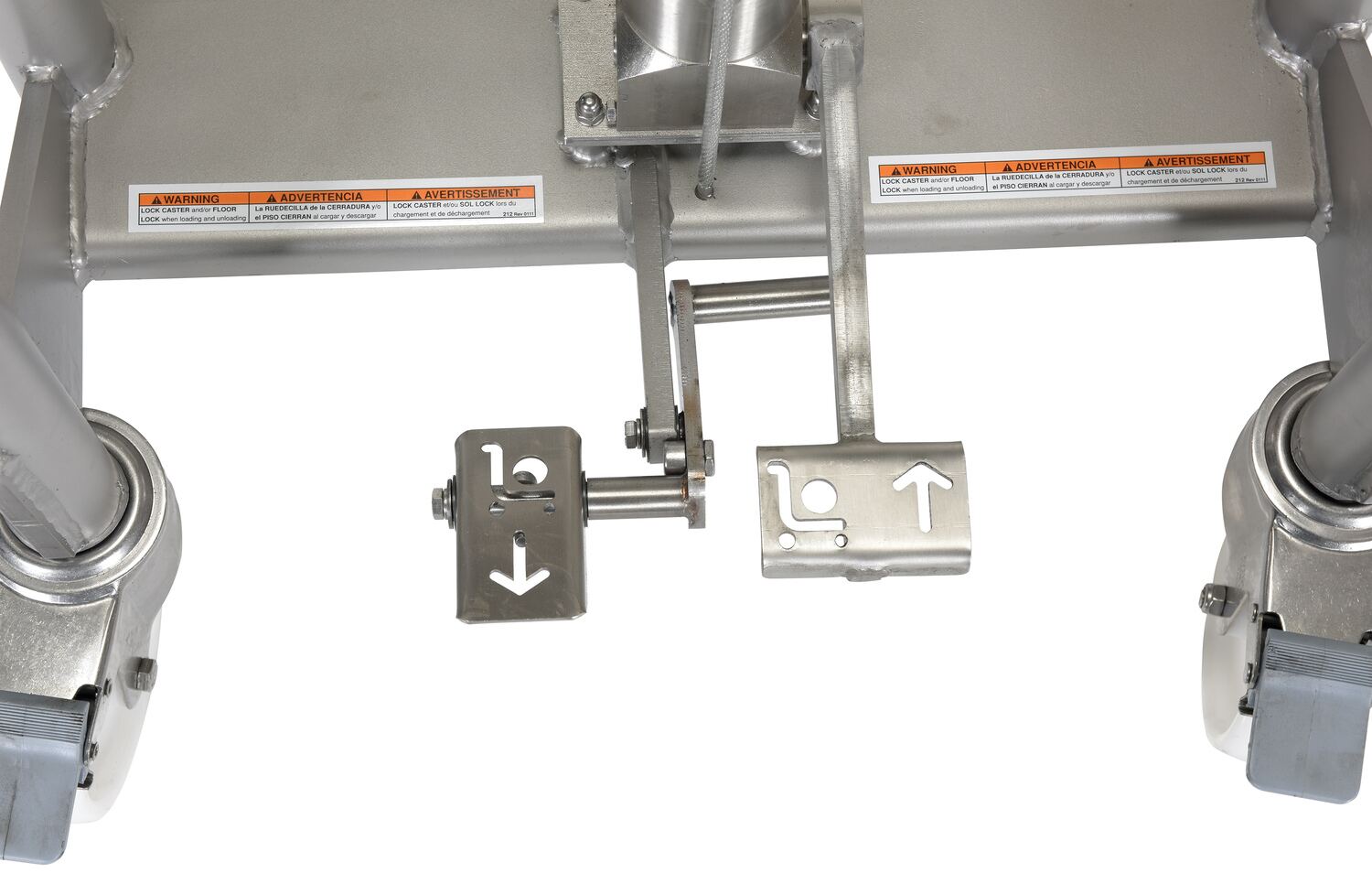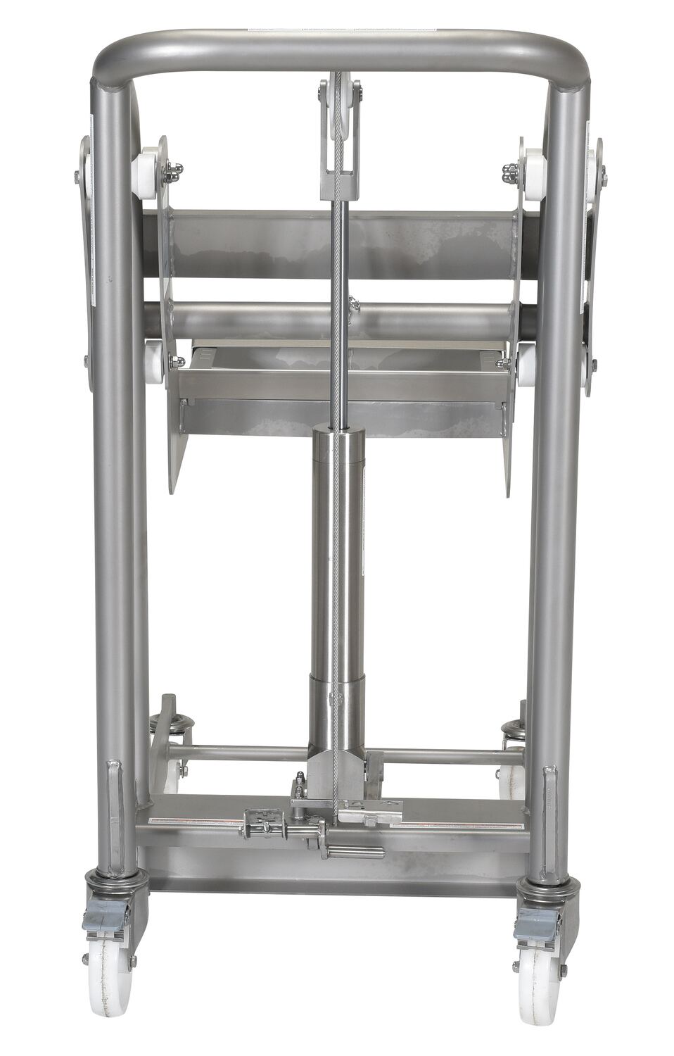 A 304 Stainless Steel Hydraulic Foot Pump Roll Handler is great for an assortment of areas including the food handling service industries. The design is sleek, smooth, and easily washable for before and after use in hygienic areas. The raising and lowering of the platform to the precise position is made easy by the hydraulic foot pump design, which diminishes needless bending when loading/unloading material. The 304L stainless steel construction including hydraulic cylinders as well as the piston provides a strong structure for transferring heavy loads between work areas. A rounded handle style allows for a proper two handed grip when maneuvering around work areas, while the perfect open cradle platform lets the user load material from three sides. Cradle adjusts in 1" increments up to 16" wide. The handler rolls smoothly on four swivel casters with two attached rear brakes for safe functionality when in a resting position.