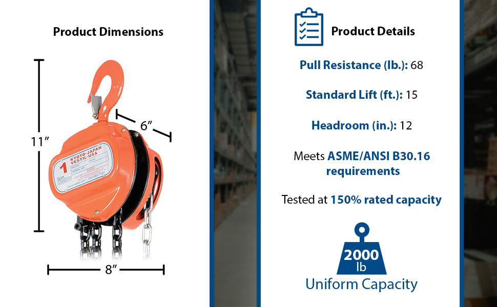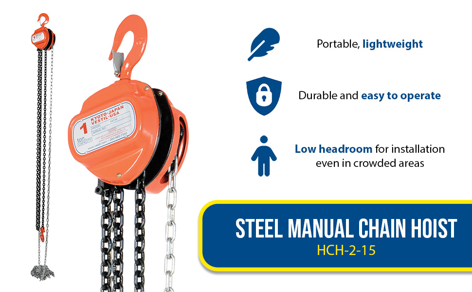HCH-2-15 HCH-2-15Steel Manual Chain Hoist 15 Ft. Lift 2,000 Lb. Capacity OrangeUniform Capacity (lb.): 2,000