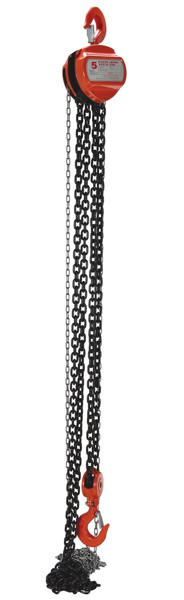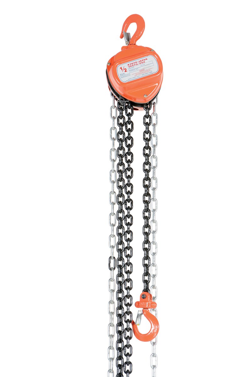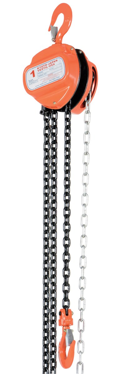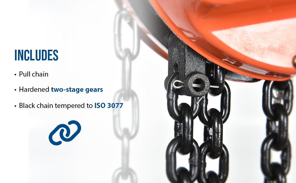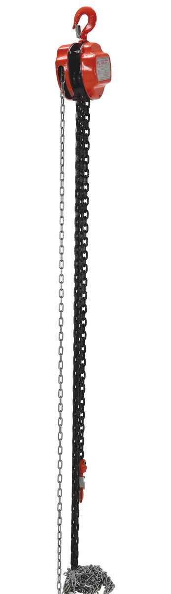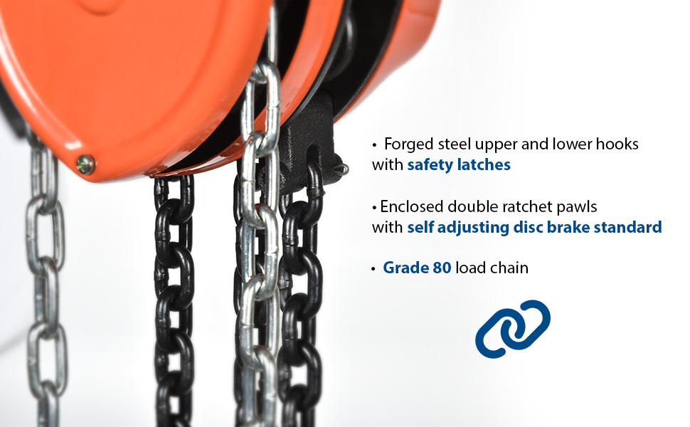 These portable, lightweight hoists are durable and easy to operate. Compact design and low headroom allow installation in confined areas. Enclosed double ratchet pawls with self adjusting disc brake standard. Designed with a safety factory 4 times rated capacity. Individually tested at 150% rated capacity. Features grade 80 black chain tempered to ISO 3077, pull chain, hardened two-stage gears and forged steel upper and lower hooks with safety latches. Constructed of high quality steel components ideal for industrial applications. Meets ANSI B30.16-2003 requirements.
