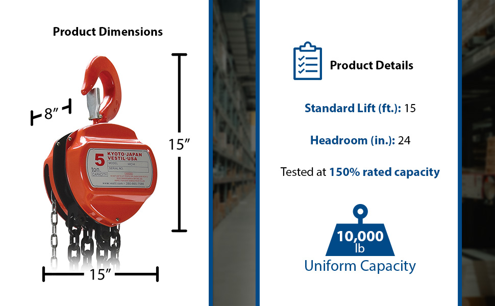 HCH-10-15 HCH-10-15Steel Manual Chain Hoist 15 Ft. Lift 10,000 Lb. Capacity OrangeUniform Capacity (lb.): 10,000