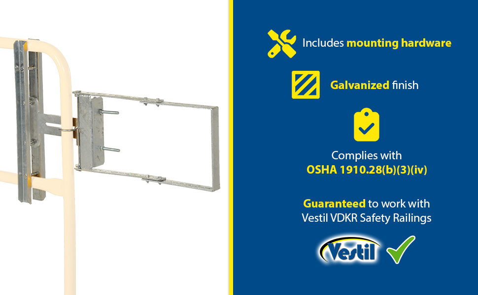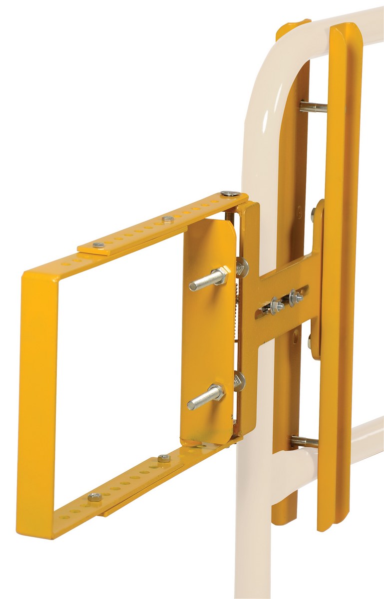 Customize your safety railings with Self-Closing Steel Gates. Gates can be mounted from the left or right with the included mounting hardware. Mount to horizontal rails that measure up to 2" diameter and are spaced 10" to 21" apart center to center. Choose from galvanized or yellow powder coat finish. Meets OSHA 1910.28(b)(3)(iv) requirements. (Railing and base not included.)
