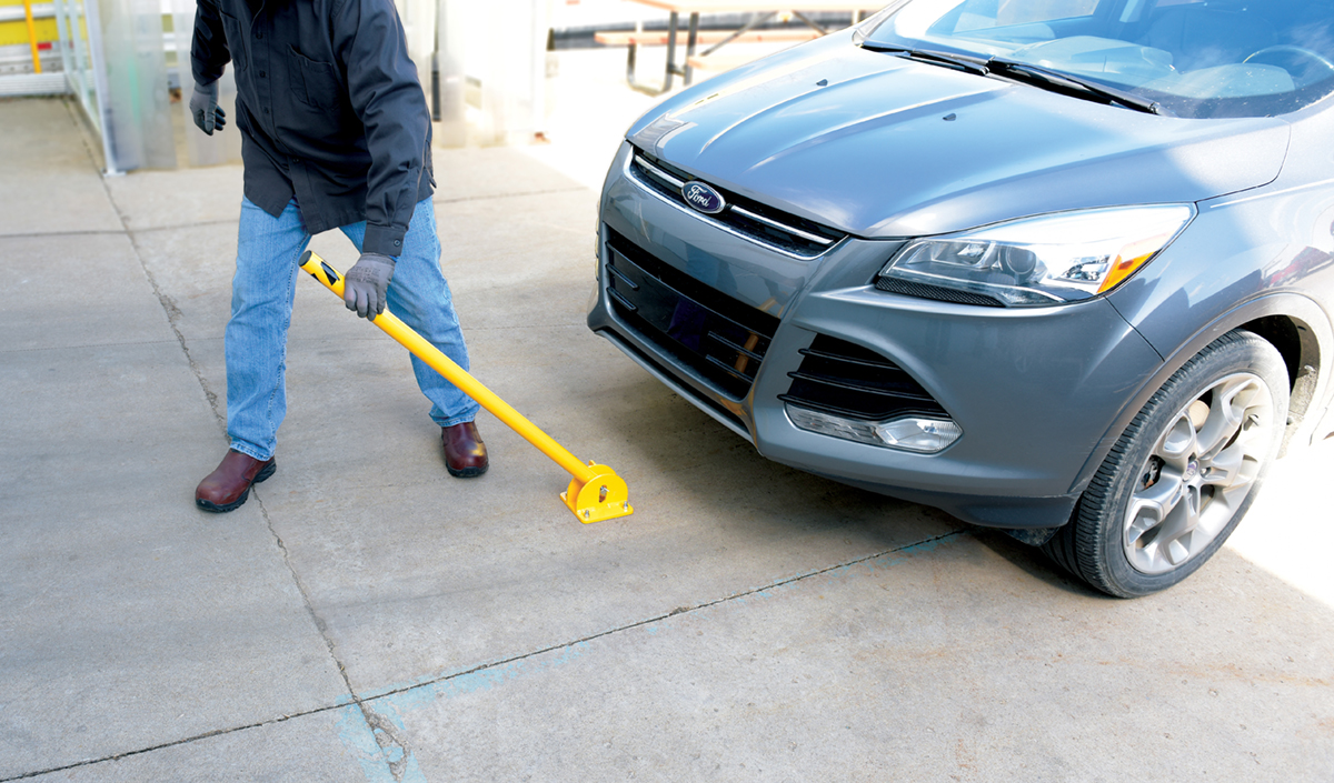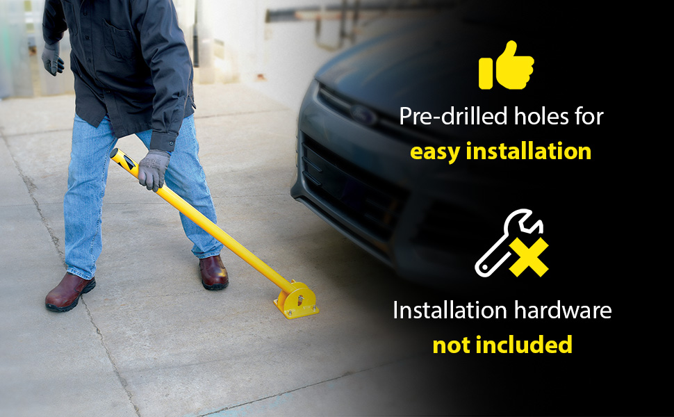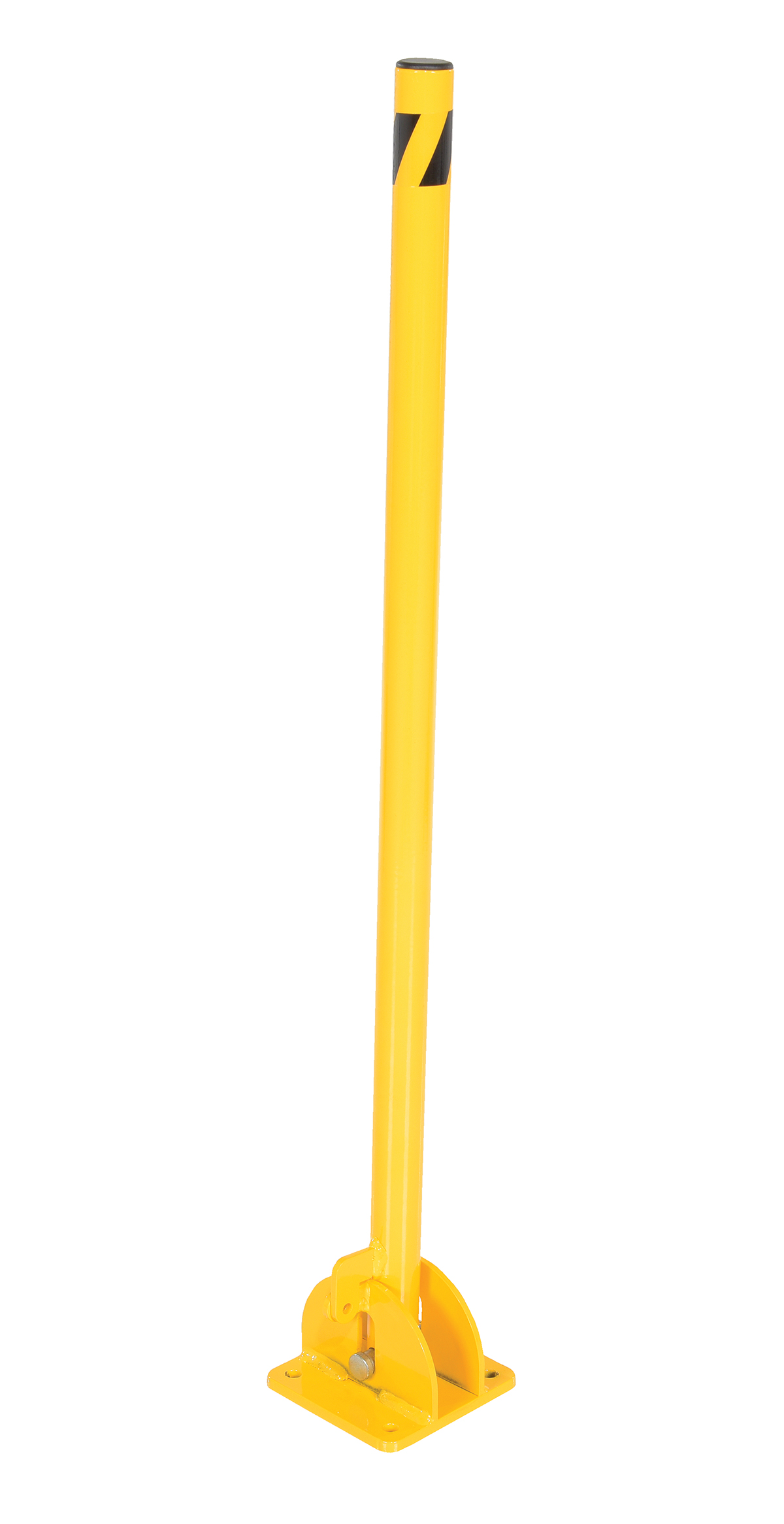Folding steel barrier post for parking control and security. Bollard is locked in the raised position with a padlock (padlock not included). When padlock is removed, bollard may be lowered to ground to allow for access. Base plate must be lagged to ground for proper installation (installation hardware not included). Steel construction. Powder coat yellow or galvanized finish.
