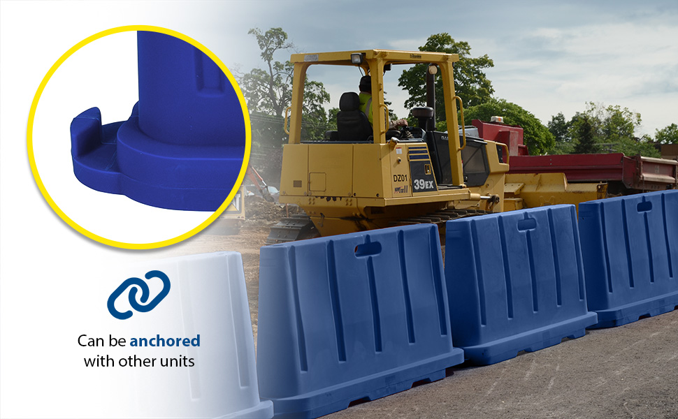 Uses 80% less storage space! Common uses include: Crowd & traffic control, area delineation, security, pedestrian protection, construction worker protection, restrict access to areas, factory & warehouse settings. Standard Features: Material thickness is 0.150" Empty weight is 37 Lb. Colors are consistent with ANSI Z535.1 safety colors Manufactured of virgin polyethylene material with UV stabilizer Overall size is 76-1/2"L X 16"W x 36"H (Effective connected length is 72") Hollow base may be filled with 5.4 gallons of water for added weight (~45 Lb.) Not for highway use.