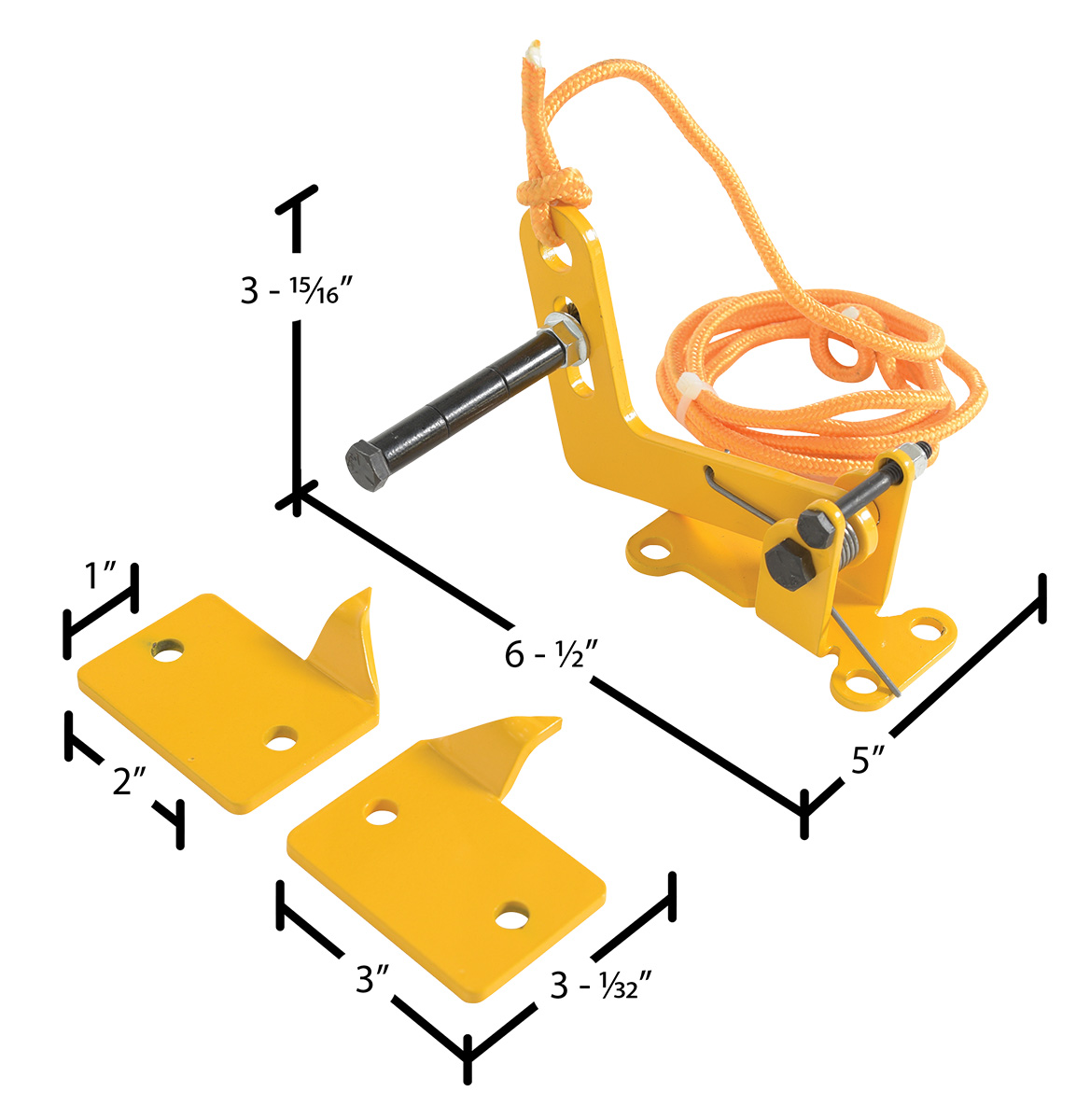 Unique product will allow overhead doors to be locked in virtually any up position. Automatically locks doors in full up position or in the closed position. Prevents the overhead door from unexpectedly "slamming down". Protects personnel, product, and equipment. Spring-loaded locking latch is released by pulling rope (included). Simply bolts to any overhead door (installation hardware is not included). Includes two reversible "locking plates" that may be mounted anywhere along door track. Steel construction with yellow baked in powder coated toughness.