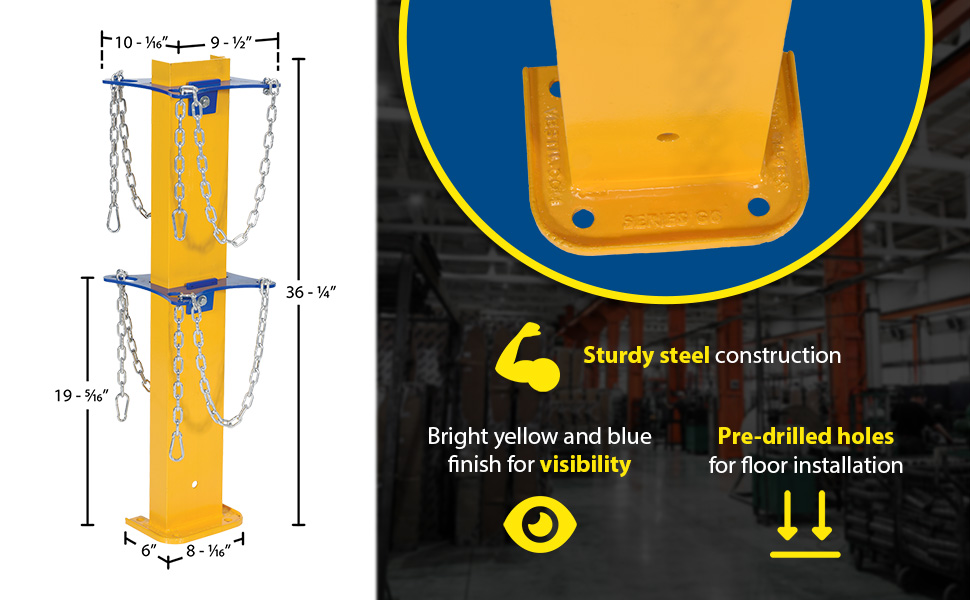 A cylinder storage stand is great for additional cylinders that are both used and unused. The sturdy steel construction with a bright yellow and blue finish endorses visibility of the unit, both near and far. Two cylinders are able to be stood in a secure position due to the shaped steel and safety chain. The unit can be secured to the floor by utilizing the pre-drilled mounting holes at the base of the stand.
