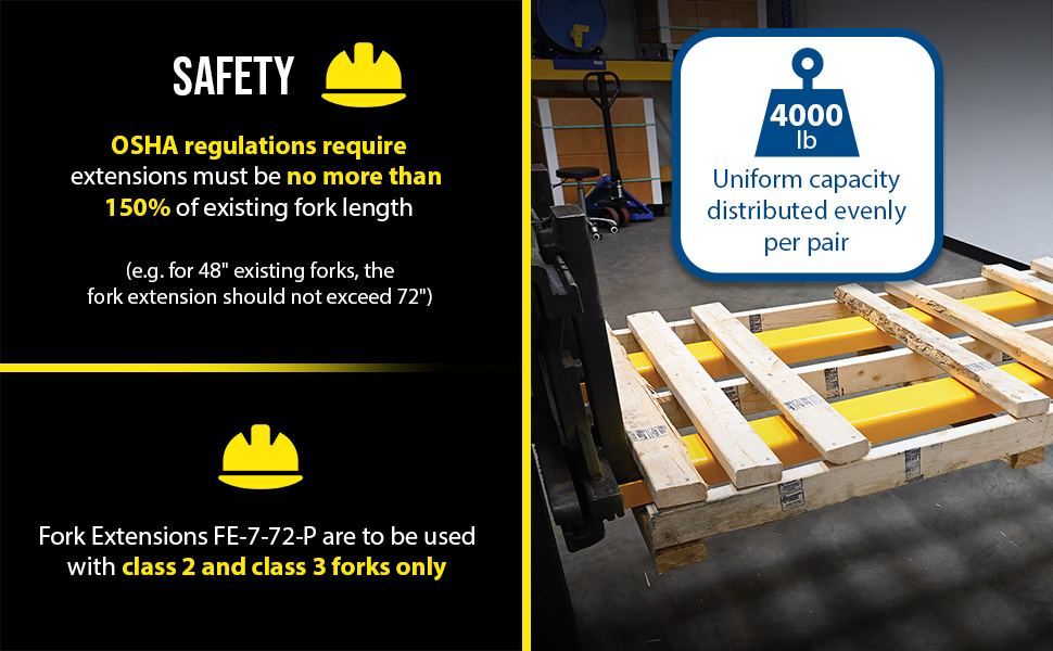 FE-7-72-P FE-7-72-PSteel Pin Style Fork Extensions 7 In. x 72 In. 4,000 Lb. Capacity YellowUniform Capacity Per Pair (lb.): 4,000