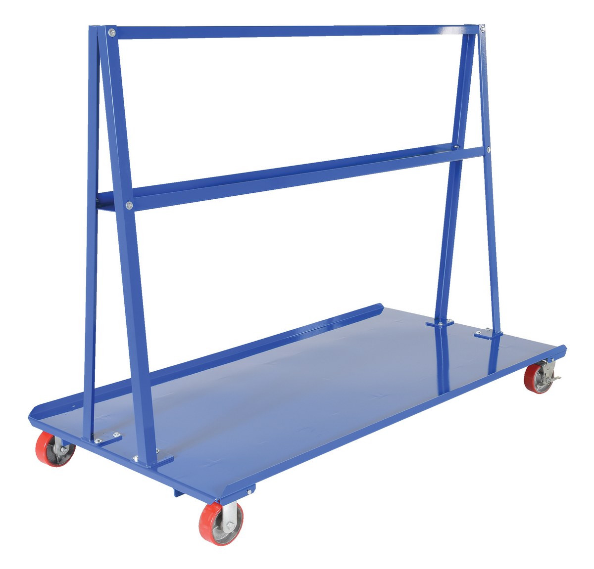 If you need to move bulky sheets of material such as drywall, plywood, paneling, or sheets of metal, you need the heavy-duty A-Frame Cart. A 1" high lip along the length of the cart prevents materials from sliding off. A convenient parts tray is included between the A-frame uprights. Unit is easily secured for loading and unloading by using the foot operated caster brake. Includes two (2) rigid and two (2) swivel with brake casters. All steel construction with a baked-in powder-coated toughness. Ships knockdown, assembly required.