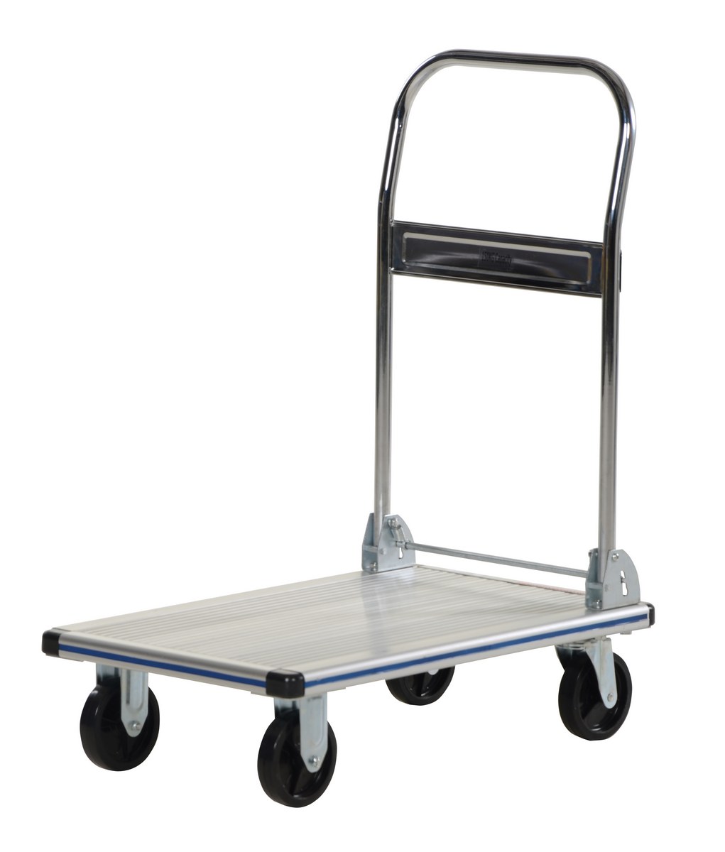 Aluminum Platform Truck With Polyurethane Casters 18-1/2 In. x 30 In. 400 Lb. Capacity SilverUse this Aluminum folding handle Platform Truck with non-marking casters for safe transportation of stacks of paper, small parts and other lightweight equipment. Ideal for maintenance rooms, offices, schools, hospitals, etc. Plastic corner protectors enhance durability and protect surroundings. The unit has a rugged aluminum construction with single handle design.