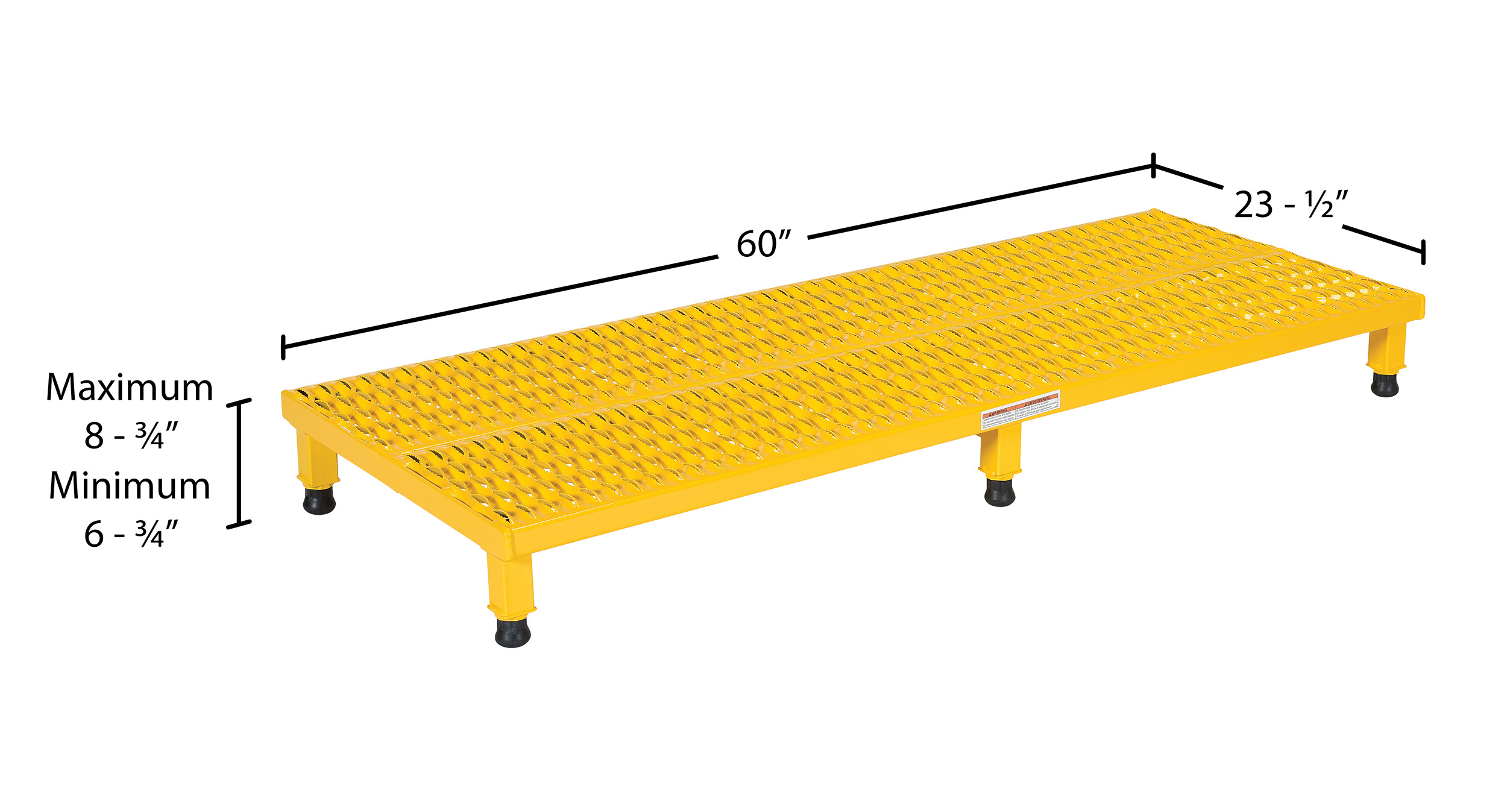 Steel Adjustable Work-Mate Stand 60 In. x 23-1/2 In. x 6-3/4 In. 500 Lb. Capacity YellowThe adjustable work-mate stand minimizes fatigue by elevating workers to heights that are comfortable and ergonomically correct. Especially useful when multiple shift employees operate the same piece of machinery. The height of each leg can be adjusted individually to ensure proper working height.