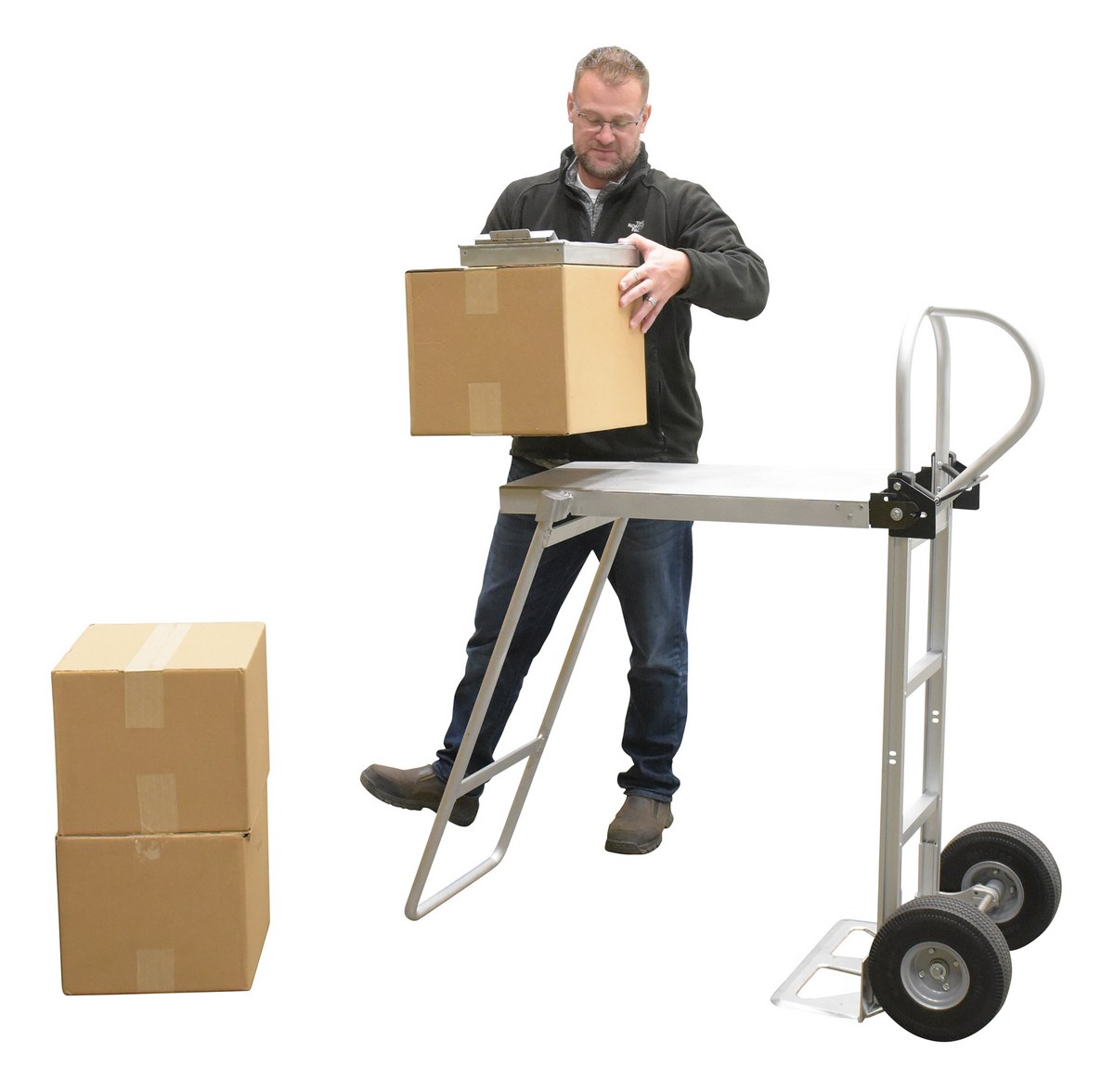 This lightweight aluminum hand truck features an integral work bench. Work bench conveniently folds flat for storage. Now a sturdy work bench can be moved to where it is needed most. Provides for a more comfortable and ergonomically correct work position. P-handle design allows for easy maneuverability.