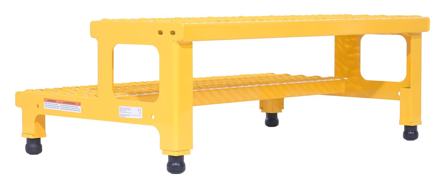 Steel Adjustable Step Mate Stand 2 Step 22-7/8 In. x 36-3/16 In. x 15-1/4 In. 500 Lb. Capacity YellowThe adjustable step-mate stand can be used as either a comfortable worker platform or a semi-permanent step. The serrated surface ensures safe footing. The legs adjust individually by screwing them into or out of the leg base.